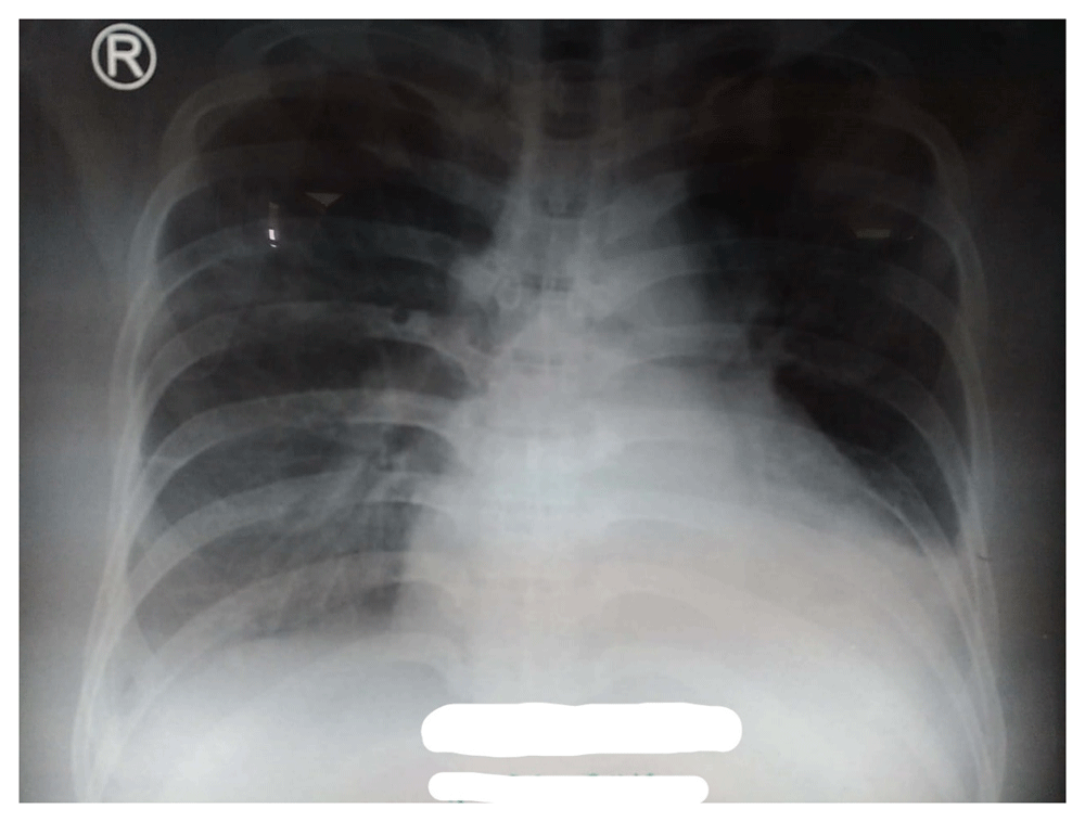 A 37-year-old Indonesian man was referred to the emergency department of Dr. Soetomo General Hospital, Indonesia, in June 2019, with complaints of shortness of breath and swollen legs. His occupation was a farmer. Two months earlier, the patient went to the public health center for a prolonged cough (± 5 months), which was sometimes accompanied by shortness of breath. In the public health center, acid-fast bacillus (AFB) testing was performed with a negative result. Based on a chest radiograph, the doctor decided to give group 1 anti tuberculosis drugs through the public health center. The treatment prescribed was fixed dose combination, 4 tablets daily taken orally, with composition of each tablet as follows: Rifampicin 150 mg, Isoniazid 75 mg, Pirazinamide 400 mg, and Ethambutol HCl 75 mg. Thus, in the emergency department, he was referred to the pulmonology department with a diagnosis of pulmonary tuberculosis.