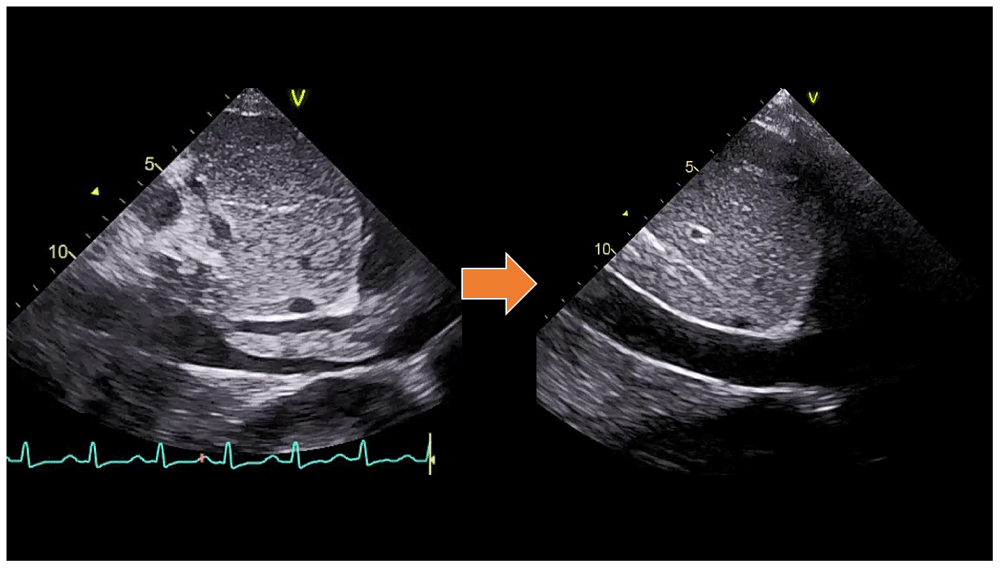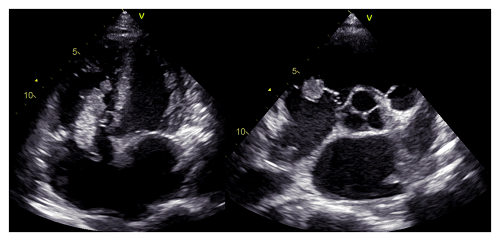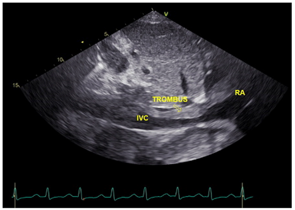 In laboratory findings, serum electrolytes revealed hypokalemia (K: 3.3 mmol/L; normal range 3.5–5.1 mmol/L), serum protein showed hypoalbuminemia (albumin: 3.1g/dL; normal range 3.4–5.0 g/dL), while other parameters were between normal limits. An electrocardiogram (ECG) showed sinus tachycardia rhythm 125 bpm, right-sided frontal axis, horizontal axis clockwise rotation, and slow progression of R waves at V1–V4 (Figure 1). A chest X-ray showed cardiomegaly, pulmonary congestion, and minimal bilateral pleural effusion (Figure 2). Echocardiographic examination revealed moderate mitral regurgitation (dilated mitral annulus), dilatation of all cardiac chambers (LVIDd 5.8 cm), visible thrombus in IVC to RA, decreased left and right ventricular systolic function (EF teich 35%, TAPSE 1.3 cm), and global hypokinetic of the left ventricle with eccentric LVH. The scans from a transthoracic echocardiogram (TTE) showing thrombus is shown in Figure 3 and Figure 4.