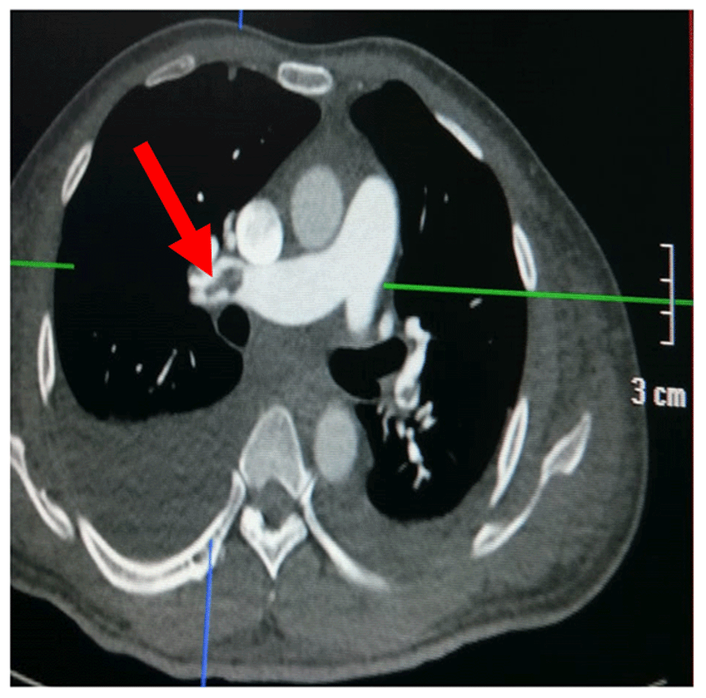One of these hemodynamic instability manifestations indicates a high-risk acute pulmonary embolism13: first is cardiac arrest; second is obstructive shock; and third is persistent hypotension. In this patient, clinical symptoms included shortness of breath, tachycardia, chest pain, coughing, signs of inferior extremity DVT, tachypnoea, bilateral basal rhonchi, neck venous distention, minimal bilateral pleural effusion, and hemodynamic disorders. This patient had an obstructive shock, therefore, he was classified into a high-risk acute pulmonary embolism.