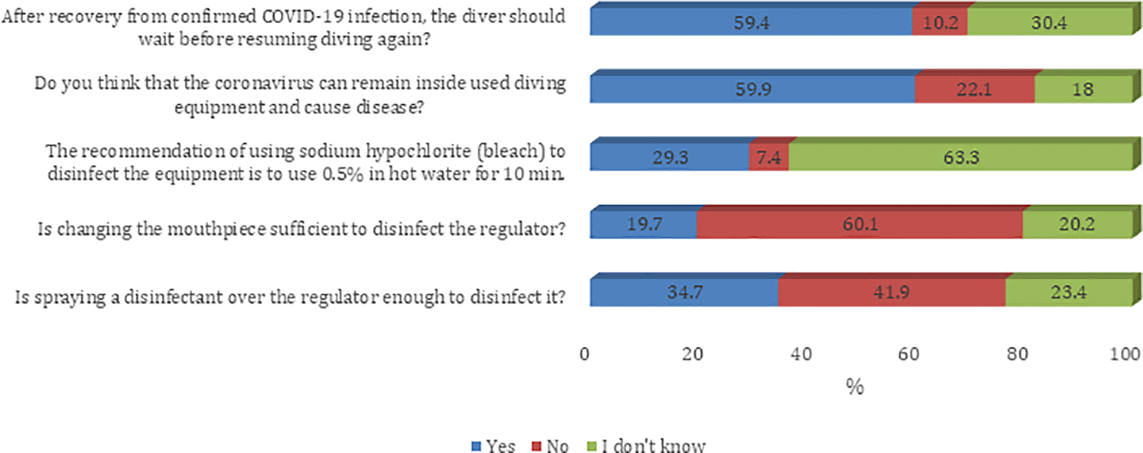 A study by Yalin et al. suggests that the use of a regulator to breathe may aid in the transmission of the virus.21 So, disinfecting regulators by submerging in a disinfectant solution is recommended. In this study, more than half of the divers were aware of the increased chances of coronavirus transmission from used diving equipment. The WHO recommends the use of sodium hypochlorite as a surface disinfectant for 10-60 minutes to kill coronavirus from the equipment surface.22 However, only a few of the respondents were aware of the method to disinfect the diving equipment using 0.1% sodium hypochlorite in cold water for a minimum of five minutes.22,23 Most of the respondents believed that changing the mouthpiece of the regulator or spraying a disinfectant was not sufficient to disinfect the regulator.