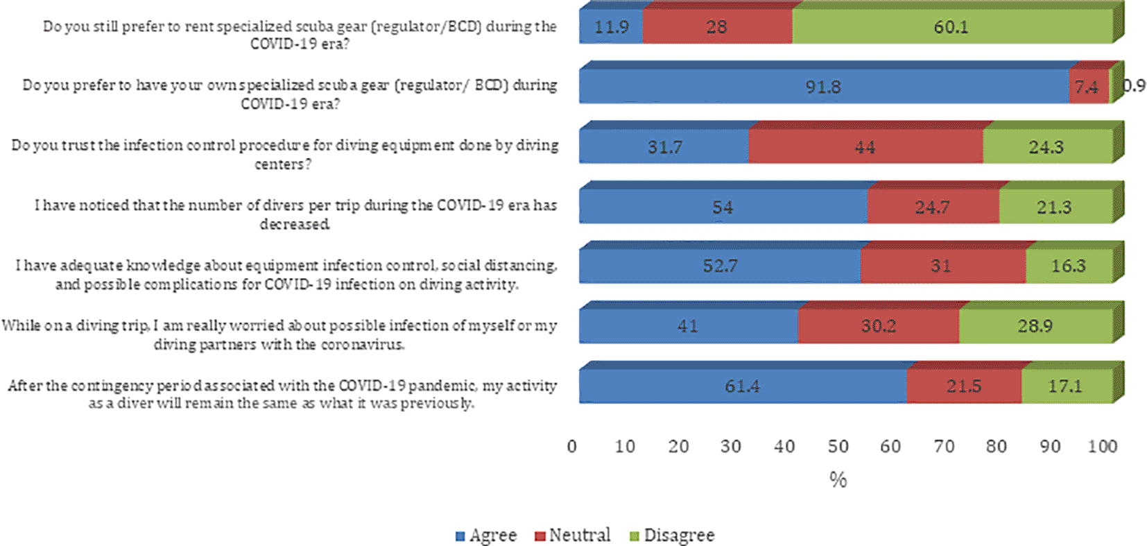 Most of the participants agreed on questions about the knowledge, attitude, and practice towards the COVID-19 pandemic. The majority of sampled divers (59.4%) believe that after recovery from confirmed COVID-19 infection the diver should wait before resuming diving again. In addition, 59.9% agree that the coronavirus can remain inside used diving equipment and can cause COVID-19 infection ( Figure 1). Most of the participants agree that they prefer to have their own specialized scuba gear (regulator/BCD) during the COVID-19 era (91.8%). Furthermore, most of the participants believe that their diving activity will remain the same as what it was before the COVID-19 pandemic (61.4%). Also, sampled divers reported a decreased number of divers per trip during the COVID-19 era (54.0%). About half of sampled divers believe that they have adequate knowledge about equipment infection control, social distancing, and possible complications for COVID-19 infection on diving activity (52.7%) ( Figure 2). The majority of the participants agree on all questions on procedures and guidelines to prevent the spread of COVID-19 infection except the need to disinfect the tank valve before attaching the first-stage regulator (45.8%) ( Figures 3 and 4).