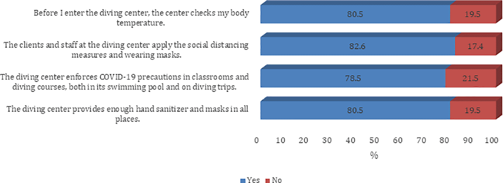 Precautions being followed at the diving centers were largely reported to be adequate. When asked about infection control measures against the COVID-19 pandemic at the diving center, 4 in 5 respondents said they experienced temperature checks before entering the diving centers. About four out of five respondents also felt that clients and staff at the diving center practiced adequate social distancing norms and were wearing face masks. About 78% of divers felt that diving centers were enforcing COVID-19 precautions in classrooms and diving courses, both in swimming pools and during diving trips. Most of them felt that the diving center provided a sufficient amount of sanitizer and an adequate number of face masks at all locations.
