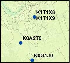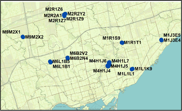 Shapefiles which store geospatial data [points, lines or polygons] with related attribute information and depict the 2016 census geographic boundaries of FSAs across Canada were obtained from Statistics Canada. PC boundary shapefiles created by DMTI (“DMTI_2019_CMPCS_LocalDeliveryUnitsRegion.shp”) were accessed through the Scholar's Geoportal at the University of Western Ontario. These files were used to compute latitude/longitude coordinates of the centroid for each FSA and PC (with the ArcGIS “Calculate Geometry” function), to validate PCs provided for each individual in the COVID-19 test dataset, and to convert spatial interpolation maps (such as those generated by kriging) into machine-readable text files (using ArcGIS “Intersection” function between the spatial map and with each boundary file). The ArcGIS “Split by Attribute” function was used to limit PC boundary files to the province of Ontario. This was necessary, both because data from other provinces were not available, and because of system limitations affecting processing and memory requirements for large geographic regions.