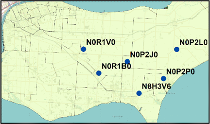 Minor discrepancies between the FSA and PC boundary files were identified which had little or no impact on our geostatistical analysis. Nearly 9% of all PCs in Ontario overlapped multiple FSAs. Most of these PCs were present in multiple locations and occurred in rural areas. Approximately 2.7% of PCs intersected with an incorrect FSA, which was likely the result of asynchronous creation of the corresponding shapefiles. These locations rarely contained many COVID-19 cases as only 11 PCs had >5 cases over any 3-day span in 2020, including: N9H 0E3 (Windsor, ON) which overlaps with the FSA N9G; N8N 0B3 (Tecumseh, ON) which overlaps the bordering FSA N8R, and M3H 5V9 (Toronto, ON) which intersected with neighboring FSA M3J. These discrepancies might impact the interpolation of cases in FSAs based on kriging analysis. Since the discrepant PCs were typically found on the border of FSAs, these conflicts had minimal effect on kriging accuracy.