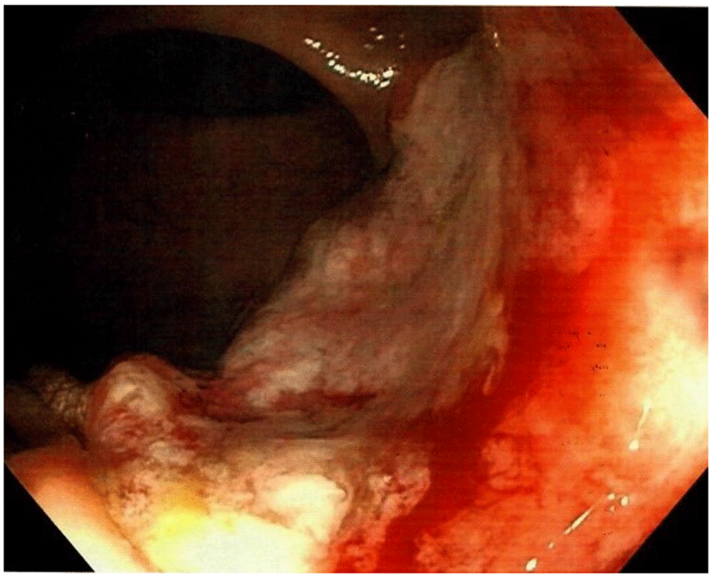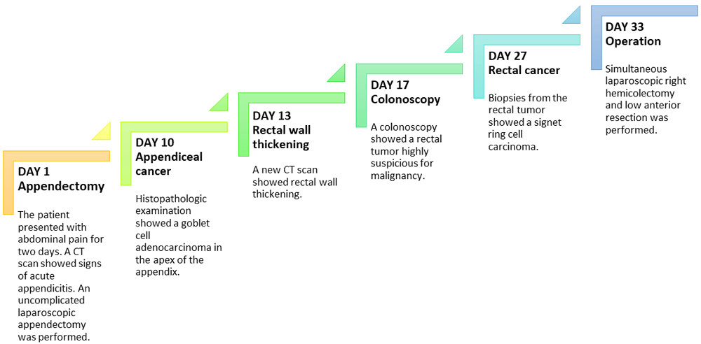 A 58-year-old Caucasian man with no prior medical or surgical history was admitted to the emergency department after referral from his general practitioner. The patient complained of constant diffuse abdominal pain for two days with exacerbation upon movement. He had had fever for one day. His stool was normal without blood and there was no nausea or vomiting. The patient had no family history of colorectal cancer. The abdominal examination revealed direct tenderness in both lower quadrants. The DRE that was performed by the newly qualified doctor on call was without palpable tumors. Laboratory blood tests showed elevated C-reactive protein (110 mg/L [normal value less than 3 mg/L]). All other blood tests were normal. An acute computed tomography (CT) scan of the abdomen showed signs of acute appendicitis. A diagnostic laparoscopy confirmed the diagnosis macroscopically and an uncomplicated laparoscopic appendectomy was performed. The patient was discharged the following day. The postoperative standard histopathologic examination of the appendix showed acute non-perforated appendicitis and, surprisingly, a 13 mm T1 goblet cell adenocarcinoma in the apex of the appendix with tumor-free resection margins. The patient was informed and underwent a new CT scan of the thorax and abdomen. The only new finding on the repeated CT scan was rectal wall thickening. The patient was discussed at a multidisciplinary team conference where it was decided to perform a colonoscopy due to the rectal wall thickening and thereafter a laparoscopic right hemicolectomy due to the tumor in the appendix. Prior to the colonoscopy, the endoscopist, who is an experienced colorectal surgeon, performed a DRE. The endoscopist palpated the distal part of a tumor in the anterior wall of the rectum seven centimeters from the anal opening. The colonoscopy showed a tumor highly suspicious for malignancy with a central depression of 25 mm (Figure 1). It was classified as National Institute for Clinical Excellence (NICE) type 3. A magnetic resonance imaging (MRI) scan staged the tumor as a T2 without metastasis to lymph nodes or distant metastasis (Figure 2). The histopathologic examination of the rectal lesion showed a primary signet ring cell carcinoma that was histologically distinct from the appendiceal tumor. Hence, the patient had two primary synchronous tumors. Eventually, the patient was treated with simultaneous laparoscopic right hemicolectomy and low anterior resection. Figure 3 presents a timeline of the events. The postoperative course was complicated by an anastomotic leakage of the colorectal anastomosis. The leakage was treated with endoscopic vacuum-assisted closure. After surgery, the patient received adjuvant chemotherapy.