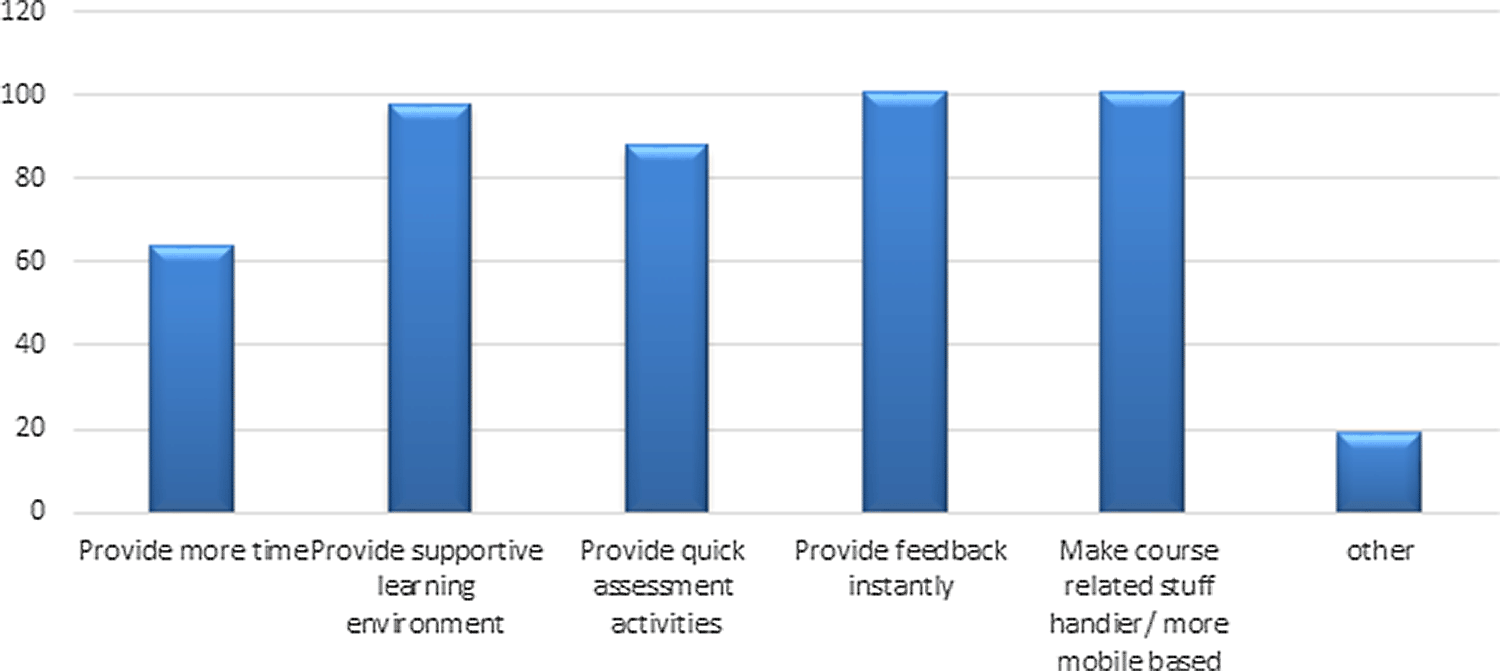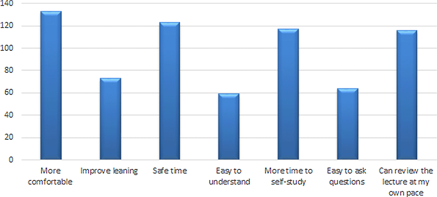 This study also explored students’ opinions on how the faculty performed differently to support students' learning and >60% of the population suggested an effective learning environment, regular assessment activities, and instant feedback would be beneficial to monitor students' learning which is in line with the findings of a previous study.23 Moreover, technology-enhanced learning may make it easier for students to follow their course content electronically at their own pace.24 Various studies highlighted technology-enhanced learning and teaching as a significant revolution in all educational settings. Literature also suggests smartphones as a new paradigm in higher education for overcoming obstacles25 and educational providers may also consider using apps such as Menti, Kahoot, Formative, Socrative, and Turning Point to assess learning of larger groups. The most unique benefit is that there are many ways through which learning can be more effective thus further enhance the quality of online teaching practice in higher education.