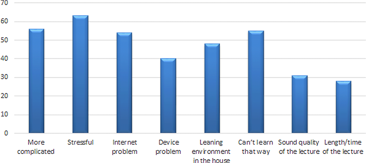 It could be deemed that the responses provided to several of the questions/statements indicated that the students were positively disposed towards some aspects of online learning: namely, communication and faculty provided online material which helped students to understand the topics and contributed to their satisfaction with the technical support provided to them during lectures or examinations. Additionally, 19% found it is more comfortable and 18% thought that online teaching was less time consuming. Conversely, 17% found it took more time to study while more than 50% agreed that they would recommend it in the future but with some concerns (e.g. more complicated, stressful, internet problem in the area or cannot learn this way).