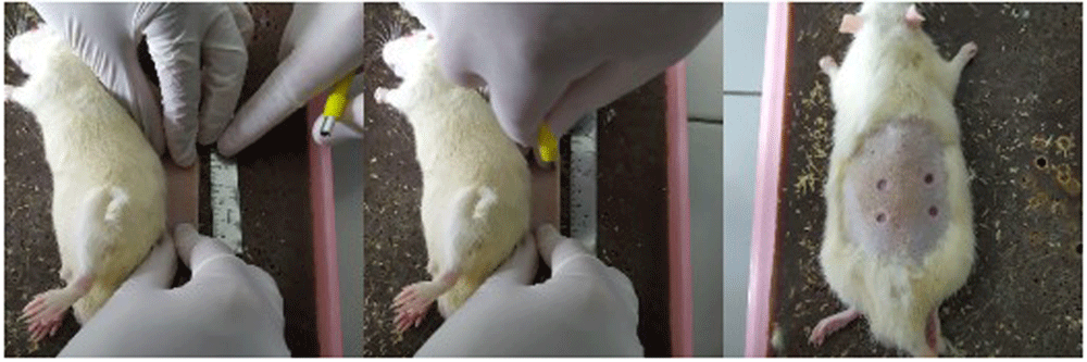 - JPG file of the installation of excision wounds on the rats. The skin on the back of a rat was folded and lifted by pinching the cranial and caudal skin between the thumb and forefinger. The rat was placed in the lateral position, and a biopsy punch was made through the folded skin (middle). Appearance of the resulting symmetrical and full-thickness wounds. No modifications have been made to this image.