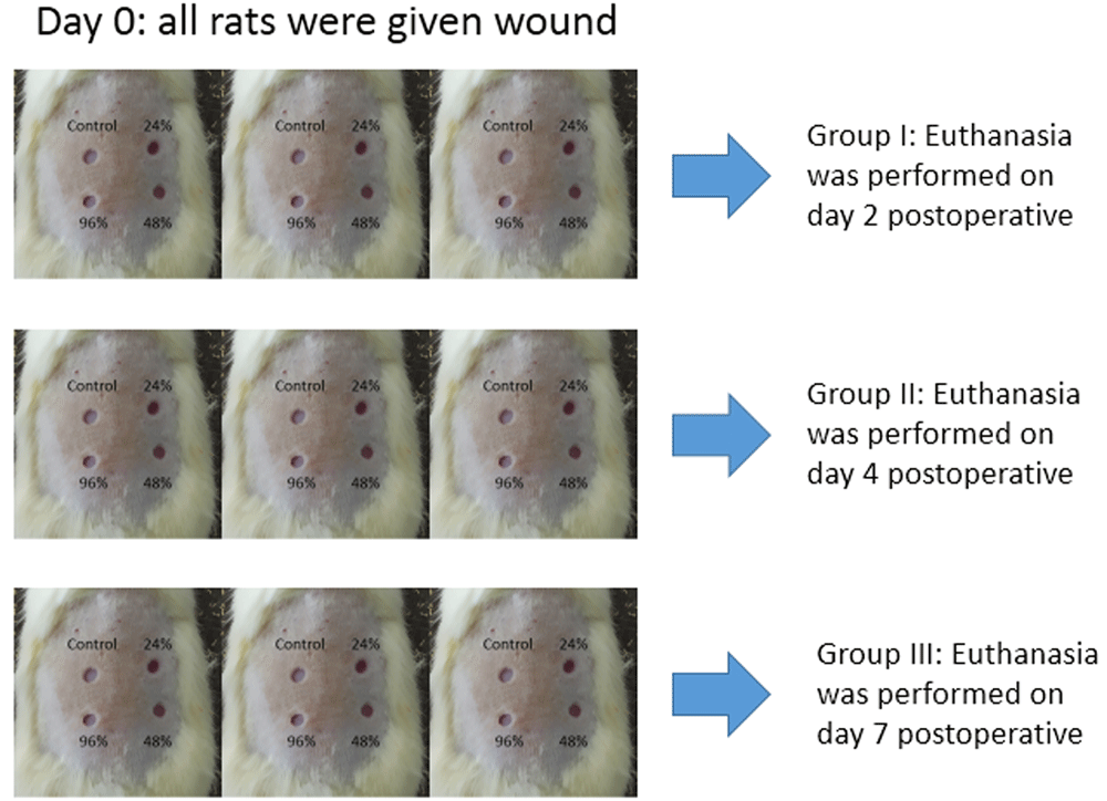 The rats were included in the study if they were 3–4 months old, weighed 250–300 mg, appeared healthy and physically active, and there were no visible anatomical defects. The rats were excluded in the study if they had postoperative infections or died before the euthanasia process. They were randomly divided into three groups of euthanasia day (three rats/group). Random numbers were generated using the standard = RAND() function in Microsoft Excel. The rats were anesthetized with 100 mg/kg BW ketamine and 4 mg/kg xylazine intramuscularly. The back of each rat was shaved, marked, and disinfected with 70% alcohol. A circular subcutaneous excision wound was made by punch biopsy of 5 mm. The skin on the back of a rat was folded and lifted by pinching the cranial and caudal skin between the thumb and forefinger. The rat was placed in the lateral position, and a biopsy punch was made through the folded skin (middle). Appearance of the resulting symmetrical and full-thickness wounds is shown in Figure 1. The minimum distance between wounds was 5 mm. Each rat was given 4 wounds which were given different experiments (24%, 48%, 96% and control gels), so the total was nine rats with 36 wounds (each experiments were nine wounds which were observed on day two, four, and seven). The total rats in each groups are described in Figure 2. The calculation of the number of samples and four wounds on the back of the rats and this fulfills the requirements of reduce, reuse, and recycle.