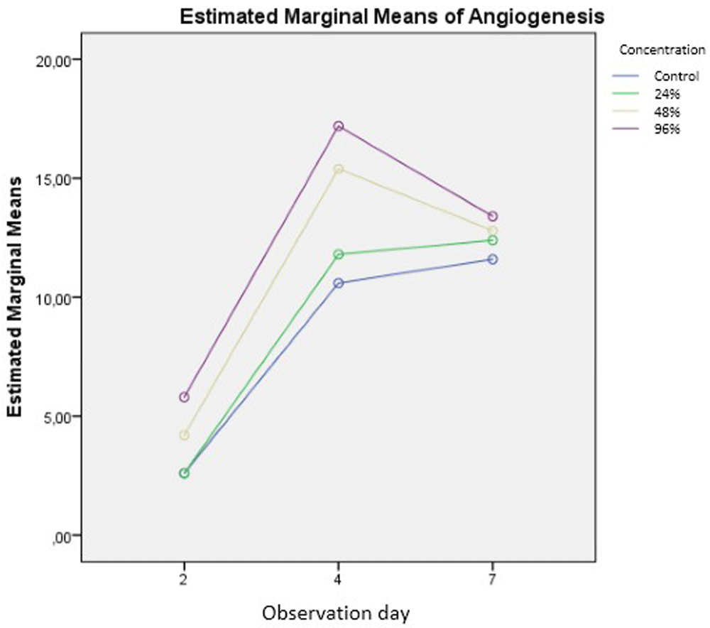 Two-way ANOVA was used to determine significant differences in the extent of angiogenesis and number of observation days among the treatment groups. Differences in number of observation days, concentration, and the interaction of number of observation days and concentration were significant with 0.000, 0.000, and 0.001 (p < 0.05), respectively. These results demonstrate that each of the independent variables analyzed has a significant effect on angiogenesis.