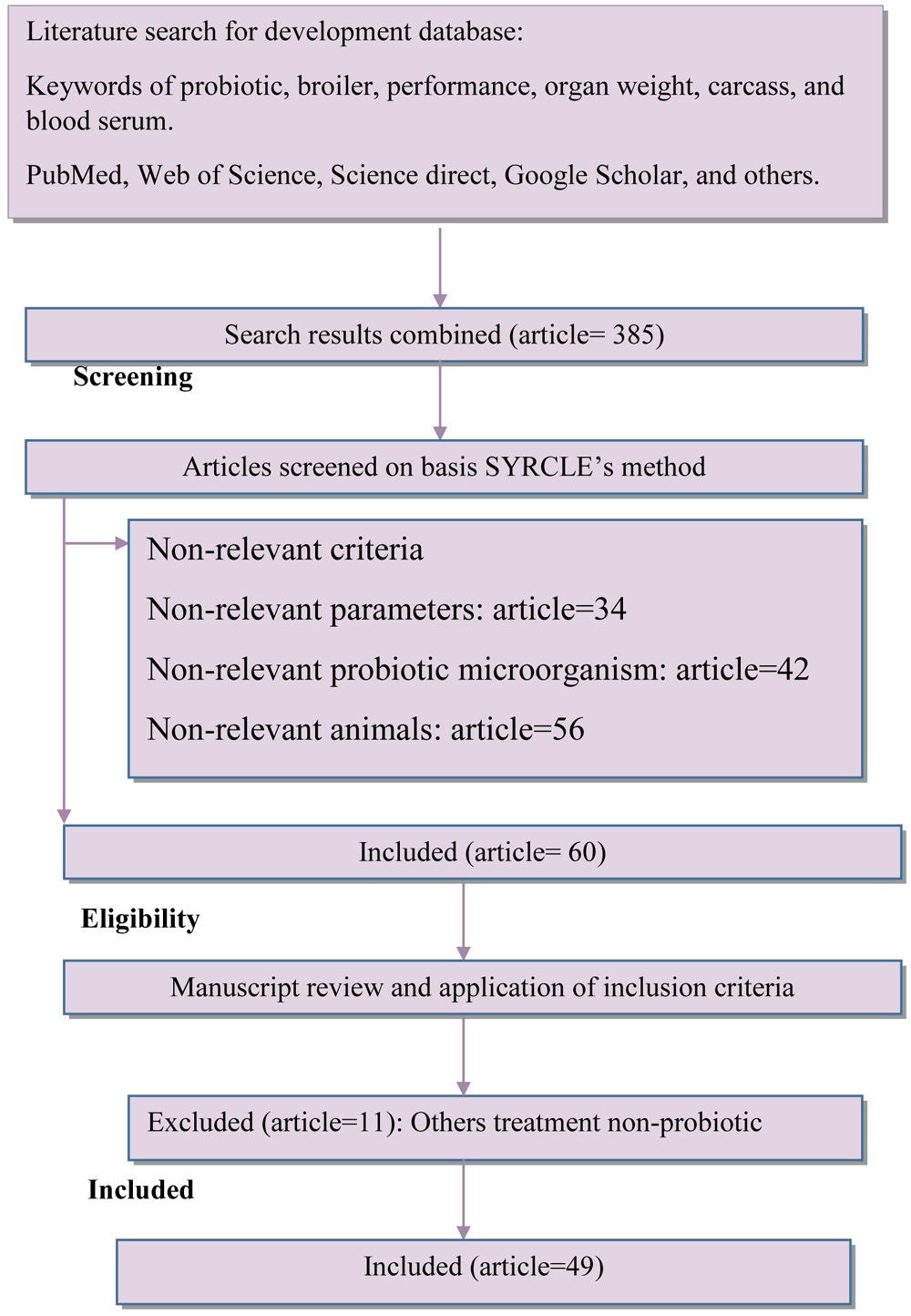 A database was constructed based on peer-reviewed and published research articles which reported the use of probiotics in the broiler diet. Articles were selected based on the Systematic Review Center for Laboratory Animal Experimentation (SYRCLE') method7 and Preferred Reporting Items for Systematic Review and Meta-Analyses (PRISMA)8. Articles selected were taken from PubMed, Web of science, Scopus, Google Scholar, and Science direct databases as well as individual journals such as World Poultry Journal Science, British Poultry Science Journal, and International Journal of Poultry Science using the keywords ‘probiotic’, ‘broiler’, ‘performance’, ‘organ weight’, ‘carcass’, and ‘blood serum’. In each article evaluated, the reference list was also searched for relevant articles. The raw database information from articles, authors, year of study, broiler (strain and sex), diet used in trial, length of trial, level of treatment, form and dosage of probiotic contained in the study was recorded in a spreadsheet following the referenced method7. The parameters included were growth performance, relative organ weight, carcass quality, blood parameters, and immune responses. The strains recorded on the raw database were Ross308, which dominated at 63.26%; Arbor Acres at 32.65%; and others at 4.09%.