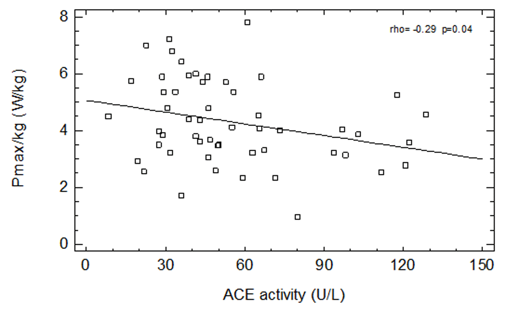 This data seems also consistent with studies based on genetic tests. Serum ACE concentration is genetically determined (an insertion/deletion – I/D polymorphism in the ACE gene)9, so depending on the genetic predisposition, reduced or increased ACE activity has been acting on the studied men for their entire life. ACE genotype and activity may be not related to muscle function tests in young subjects32. In contrast, among older people deletion polymorphism of ACE gene (DD), connected with higher level of angiotensin II, was associated with low muscle mass33. Similarly, advanced cancer patients with DD ACE gene polymorphism were characterized by higher serum ACE activity but lower hand grip strength compared with ACE insertion group34,35.