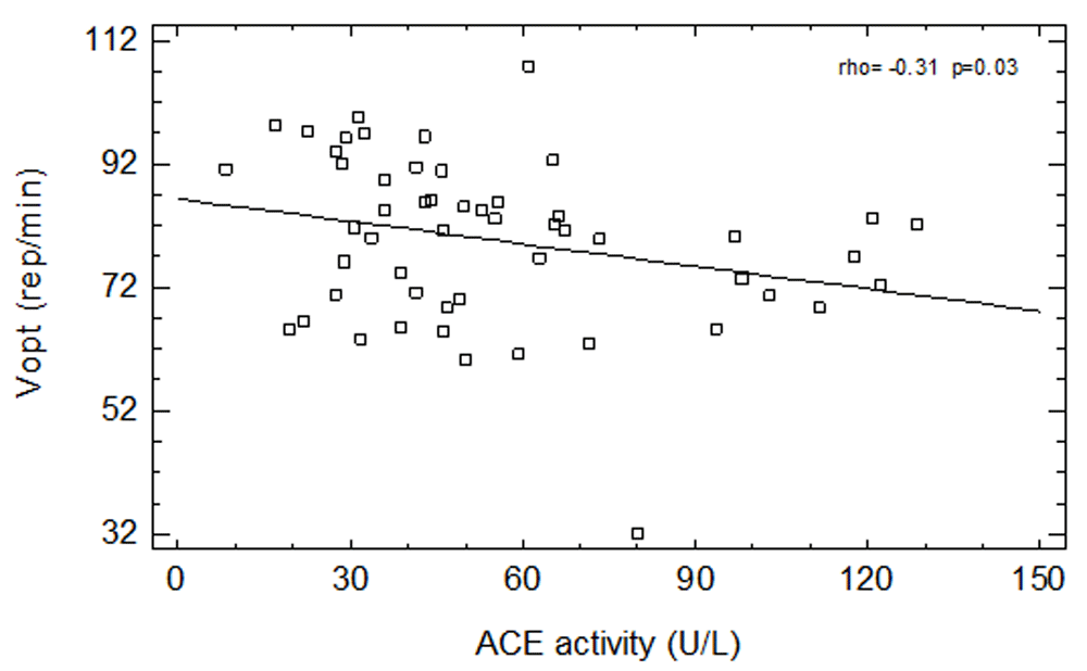 We have found a positive relationship between age and ACE activity in men not taking ACEI and in all studied patients. We have also found a negative correlation between ACE activity and Pmax (Figure 1) as well as with Ʋopt (Figure 2) in group of patients not taking ACEI and in the whole group of men (Table 2). Similar relationships were observed in group of men not taking any ASBMs – both Pmax (borderline significance) and Ʋopt were negatively correlated with serum ACE activity (Table 2).