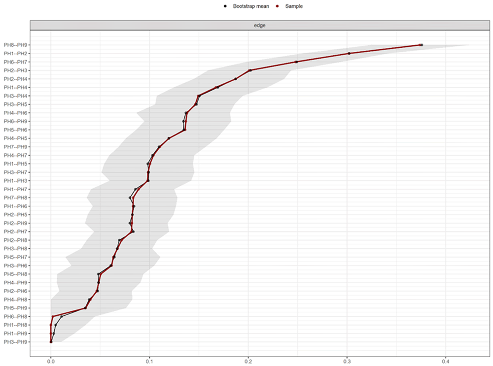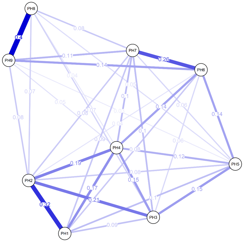 Figure 1 shows the network chart of PHQ-9 in Peruvian adults with arterial hypertension, where most of the elements are positively associated with a total of 32 possible edges, in which the highest magnitude associations are found with “Moving/ restless” (PH8) and “Suicidal thoughts” (PH9). Also highlighted is the relationships between “Moving/ restless” (PH8) “Interest loss” (PH1) and “Depressed mood” (PH2), and the connection of “Feelings of worthlessness” (PH6) and “Trouble concentrating” (PH7). Other measures of centrality have highlighted greater closeness (1.57) and brokering (1.12) in reagent 6. Figure 2 shows the PHQ-9 network estimated border weight confidence intervals.