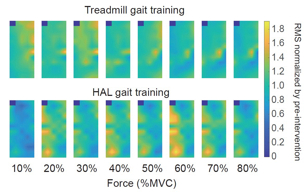 We applied multichannel SEMG as a neuromuscular activation assessment of HAL training. In addition to the overall increase in EMG activity, the HAL gait training resulted in decrease force fluctuation, and greater heterogeneity in spatial muscle distribution pattern from pre-intervention to post-intervention than for the treadmill gait training.