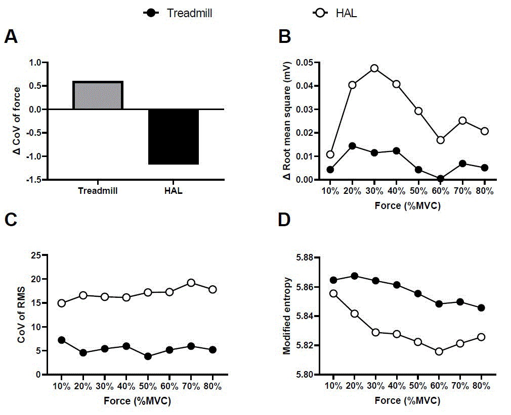As a neuromuscular activation assessment, multi-channel SEMG was performed on the patient before and after both gait training. Figure 1 illustrates the representative multi-channel SEMG amplitude color maps for treadmill and HAL gait training. We normalized the CoV of force and RMS estimates to the values obtained pre-intervention for each torque level. Differences were observed in the multi-channel SEMG spatial distribution pattern at each contraction torque between HAL and treadmill gait training. There was a greater decrease ΔCoV force with the HAL gait training than for treadmill gait training (Figure 2A). The increase in the magnitude of muscle activation from pre-intervention to post-intervention was greater for HAL gait training than for treadmill gait training (Figure 2B). The CoV of the RMS and modified entropy at each torque in both gait trainings are shown in Figure 3. For HAL training, both the CoV of the RMS were higher and the modified entropy was lower as compared to treadmill gait training (Figure 2C and D). No adverse events were observed with either intervention. He did not experience worsening of the symptoms during each gait training.