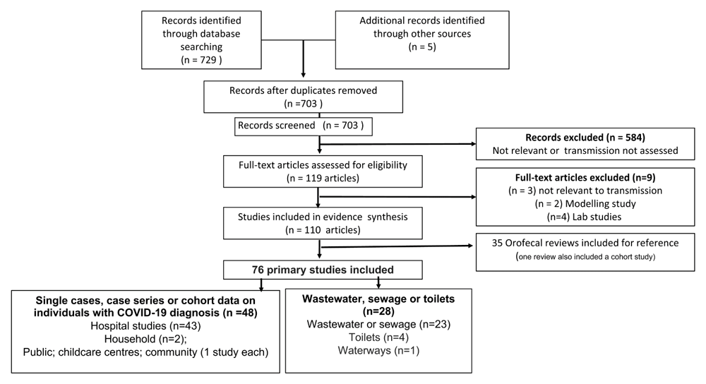 Strengths and limitations. This review is limited by the quality of included studies: many were small and did not provide a protocol that established a priori methods. Studies were often poorly reported and often did not take biases into account. Reporting is often heterogeneous and essential information such as symptom onset and cycle threshold values were often missing. We do not have information on publication bias, but the current urgency to understand SARS-CoV-2 may have an impact on research, with unknown implications and a tendency to publish those studies with positive results. It is likely we missed some studies, but we plan to keep updating this review. Furthermore, our judgments of quality are to some extended subjective and open to disagreement. This does not, however, undermine our overall assessment of the quality of the included studies. We perceive that standardization of methods in this area would improve the quality of the research. Some of these limitations increase uncertainties and prevent firm conclusions being drawn; however, this body of research provides largely consistent evidence on the main conclusions that SARS-CoV-2 is excreted fecally, is found in sewage and can be cultured from fecal samples.