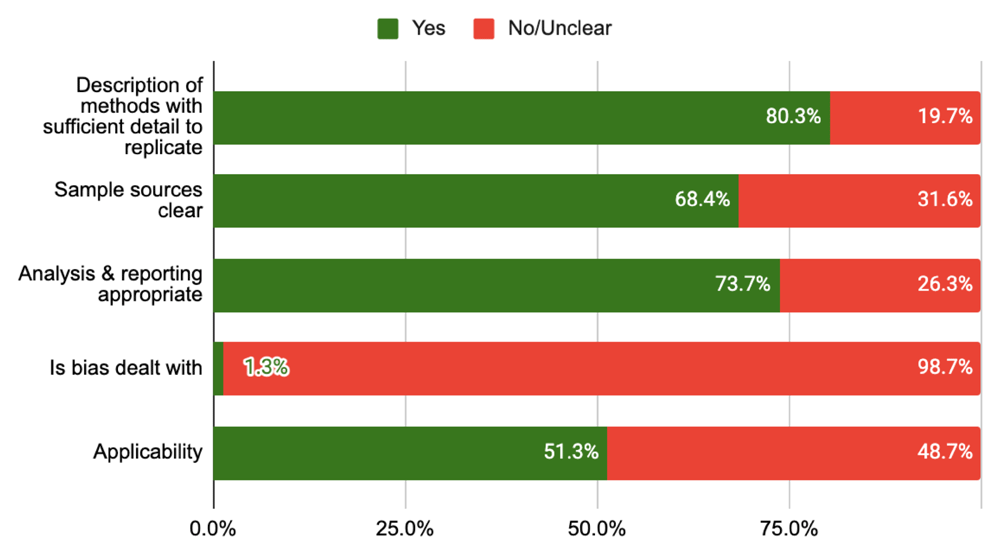 Quality of included studies. Overall the quality of the evidence was low to moderate mainly due to a lack of standardisation of techniques, omissions in reporting and a failure to account for biases in the research process (see Table 3; Figure 2). Sample sources were clear in two-thirds of studies (65.8%). Several studies mention the possibility of bias influencing their findings but did not use strategies (design or analysis) to deal with bias, and as such have been recorded as unclear risk of bias.