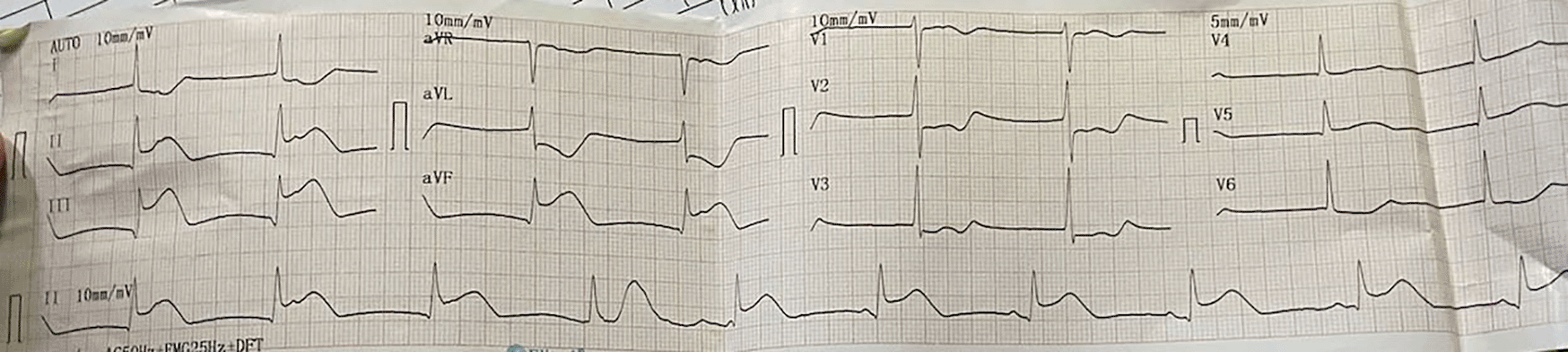 The electrocardiogram (ECG) of the patient showed TAVB with a junctional escape rhythm of 46 times per minute and inferior STEMI (Figure 1). The laboratory results of the initial visit were within normal limits, except that the blood urea nitrogen (BUN) 138 mg/dL (normal range: 8 – 23 mg/dL), creatinine serum 8.1 mg/dL (normal range: 0.6 – 1.3 mg/dL), haemoglobin (Hb) 8.6 g/dl (normal range: 11.5 – 16.5 g/dl) and troponin I increased to 30.6 ng/mL (normal range: ≤ 0.04 ng/mL).