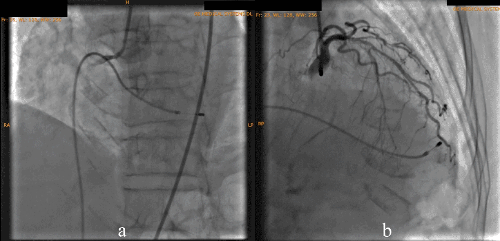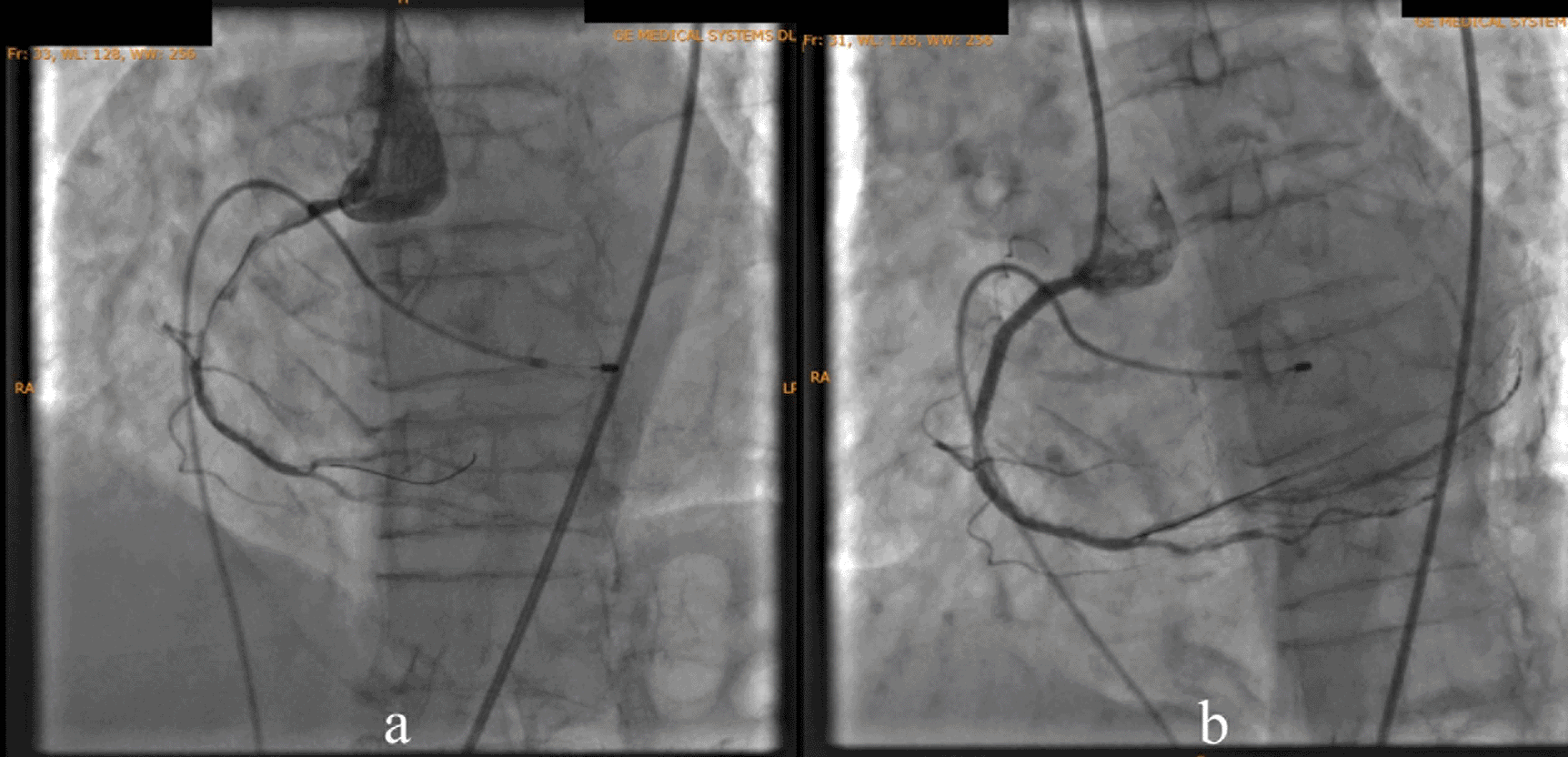 From these data, we provided this patient with a diagnosis of inferior STEMI with total AV block and ACKD. She was administered with aspilet 300 mg and clopidogrel 75 mg per oral. Subsequently, a temporary pacemaker (TPM) was installed using local anesthesia with the heart rate at 70 ×/min, the sensitivity at 3 mV and the output at 3 V, and diagnostic coronary angiography (DCA) was performed.