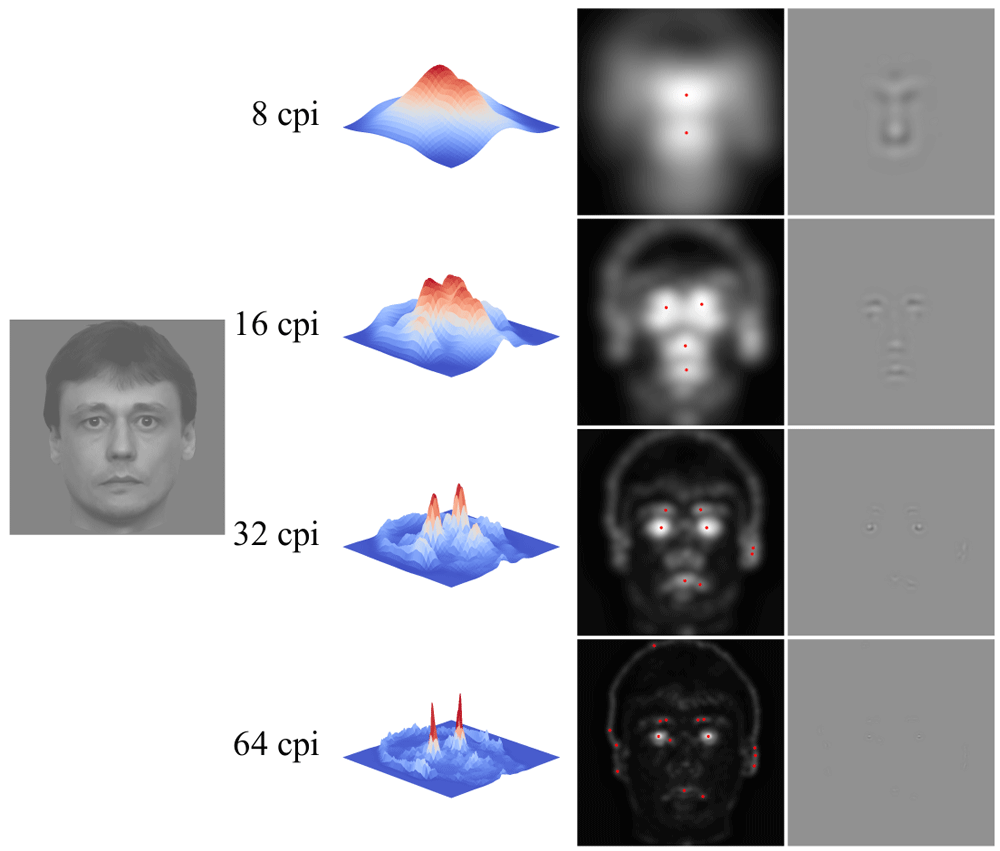 The algorithm of stimuli formation is shown in Figure 1. An initial image example can be seen on the left. Then there are spatial frequencies in cycles per image (cpi) for which space distribution of the total nonlocal contrast was defined. On the right, one may see 3D maps of space distribution of contrast modulation amplitude when using operators of various diameters. The next column demonstrates the same maps in a 2D format. Red dots on them show local maximum apexes. While processing the image with the gradient operator of the largest size with its central area diameter making one half of the image size, we selected 2 maximums, after which, in the course of operator diameter two-fold reduction, selected were 4, 8 and 16 maximums correspondingly. A round aperture with a Gaussian transfer function transmitting four image cycles (hereinafter this aperture is referred to as a “window”) was placed within positions found this way. Areas of maximum contrast modulation amplitude were combined in a new image (the right column). The total diameter of the areas found at different spatial frequencies equaled the diameter of a conventional circle with the initial image fit to it. Stimuli were the faces synthesized from the areas extracted at one spatial frequency (examples can be seen in the right column of Figure 1), as well as those resulting from the combination of these images within one aggregate image (i.e. containing all the previously used spatial frequency ranges).