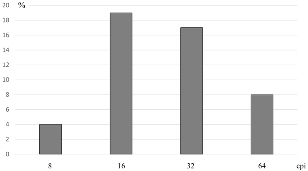 First, we compared task solution effectiveness where the face images had been formed from maximum nonlocal contrast areas belonging to the narrow spatial frequency range. It is worth reminding that the lesser the diameter of the areas, the higher the spatial frequency (cpi) contained in them and the greater the general number of the areas found. Where synthesized face images contained space frequencies of just one range of 1 octave, the general result of facial expression recognition was low (Figure 2). The performance was higher for the stimuli formed from the areas with the maximum increase in contrast having the central spatial frequency of 16 cpi. Somewhat lower were the values of 32 cpi frequency, and much lower these were for the lowest and the highest frequency ranges. The obtained distribution generally agrees with the data suggesting that the medium spatial frequency range expressed in cycles per face is more important in face recognition (Boutet et al., 2003; Collin et al., 2006; Näsänen, 1999; Parker & Costen, 1999; Tanskanen et al., 2005; see also review Ruiz-Soler & Beltran, 2006).
