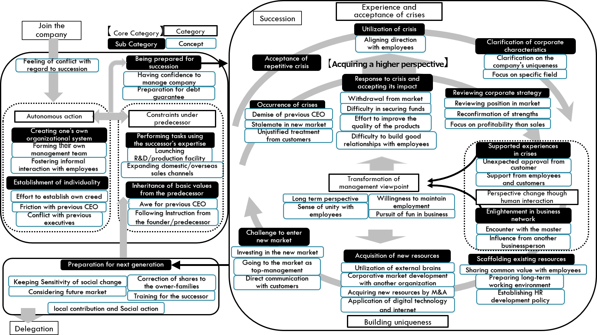 In the early stages of the succession process, the dilemma of the successors, which is described by Ochiai (2016b), is observed by the concepts ‘following the instruction of the founder/predecessor’ and ‘conflicting with the previous CEO’. However, strict frameworks such as the “Autonomy Under Guardianship” model (Ochiai, 2016a), which is defined as “autonomy with intergenerational conflict, restraint, and discipline acting as constraints and guardianship from the preceding CEO” have not been clearly observed in this study. One reason might be that the research subject of Ochiai’s study was large companies, in contrast to the companies in this research, which assign several divisions to the successors periodically. Some successors in this study joined the company to help the predecessors overcome hardship when the market was shrinking or the economy was declining; thus, there was little room to prepare for a gradual succession process. The early stage of the succession process is not simple in order to bring out the successors’ proactive behavior. However, the dilemma might be the inevitable process for overcoming the conflict and creating their axis and confidence as businesspersons, as well as accumulating legitimacy as successors.