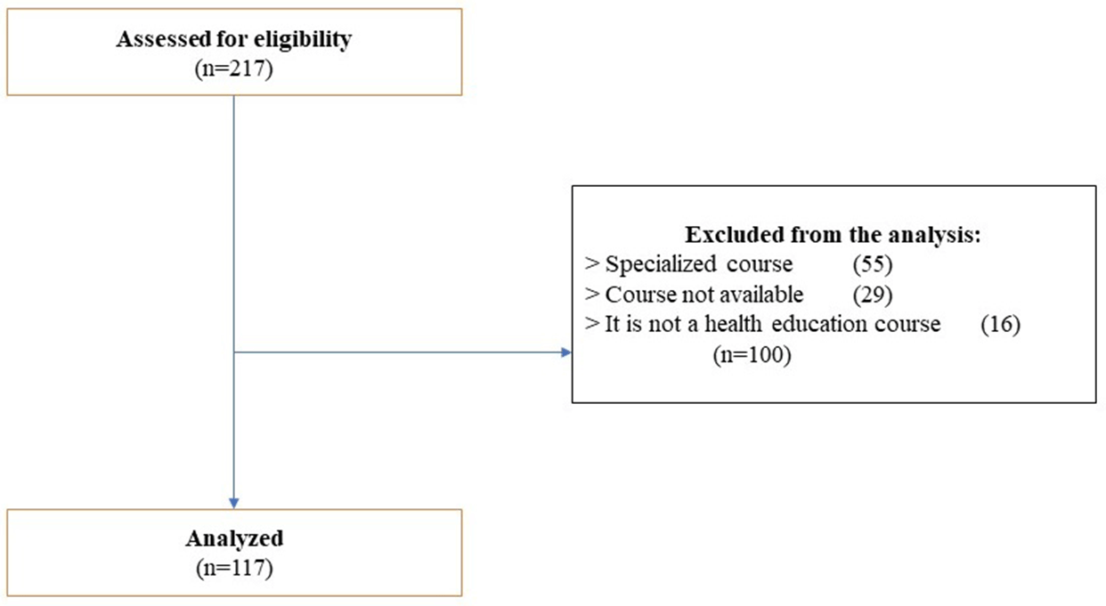 With the established search criteria, a total of 217 MOOC courses were found on the different platforms. After excluding MOOC courses because they were specialized, unavailable, aimed at other target audiences, or without relation to health education, we selected 117 of the total MOOCs to be analyzed (Figure 1).