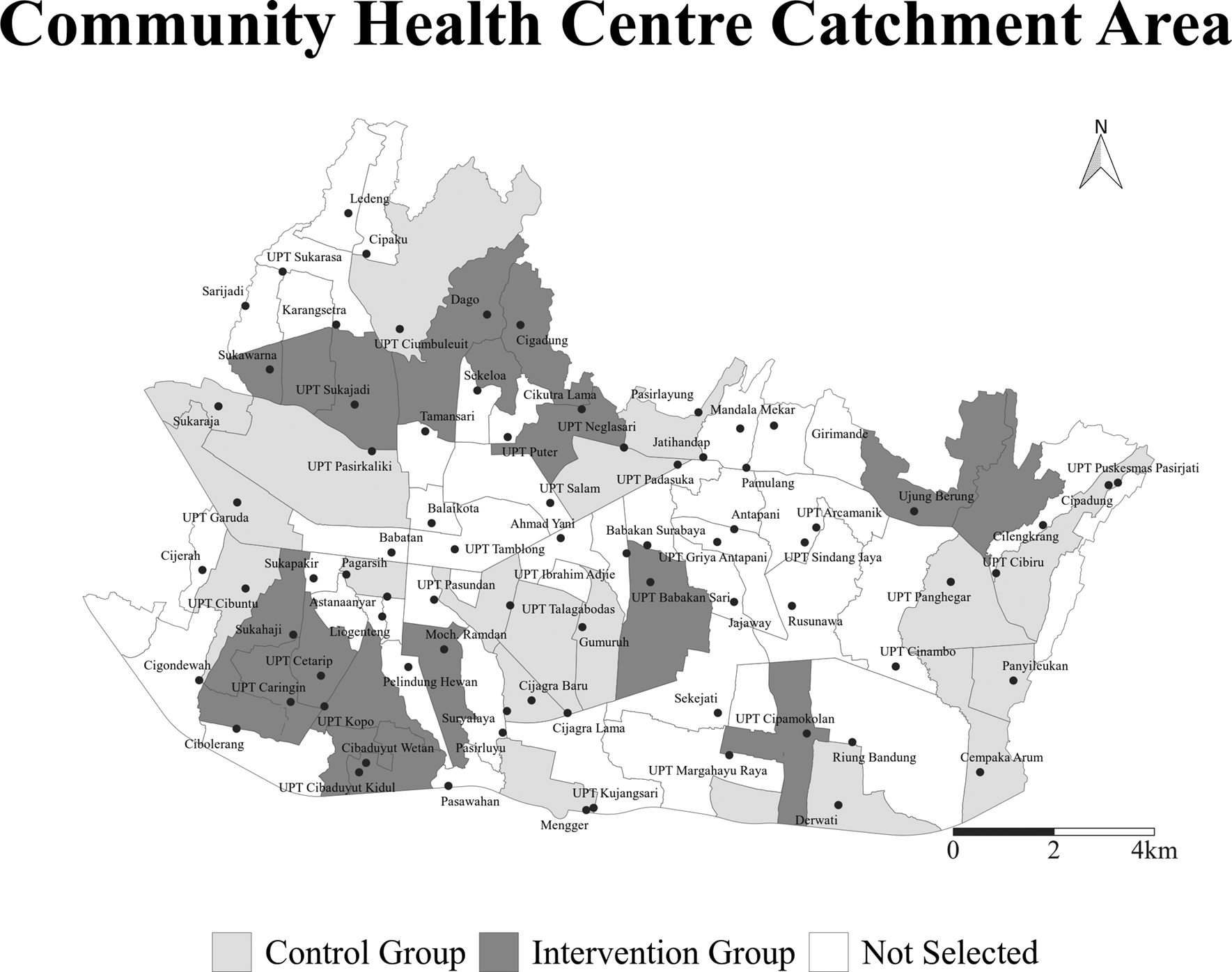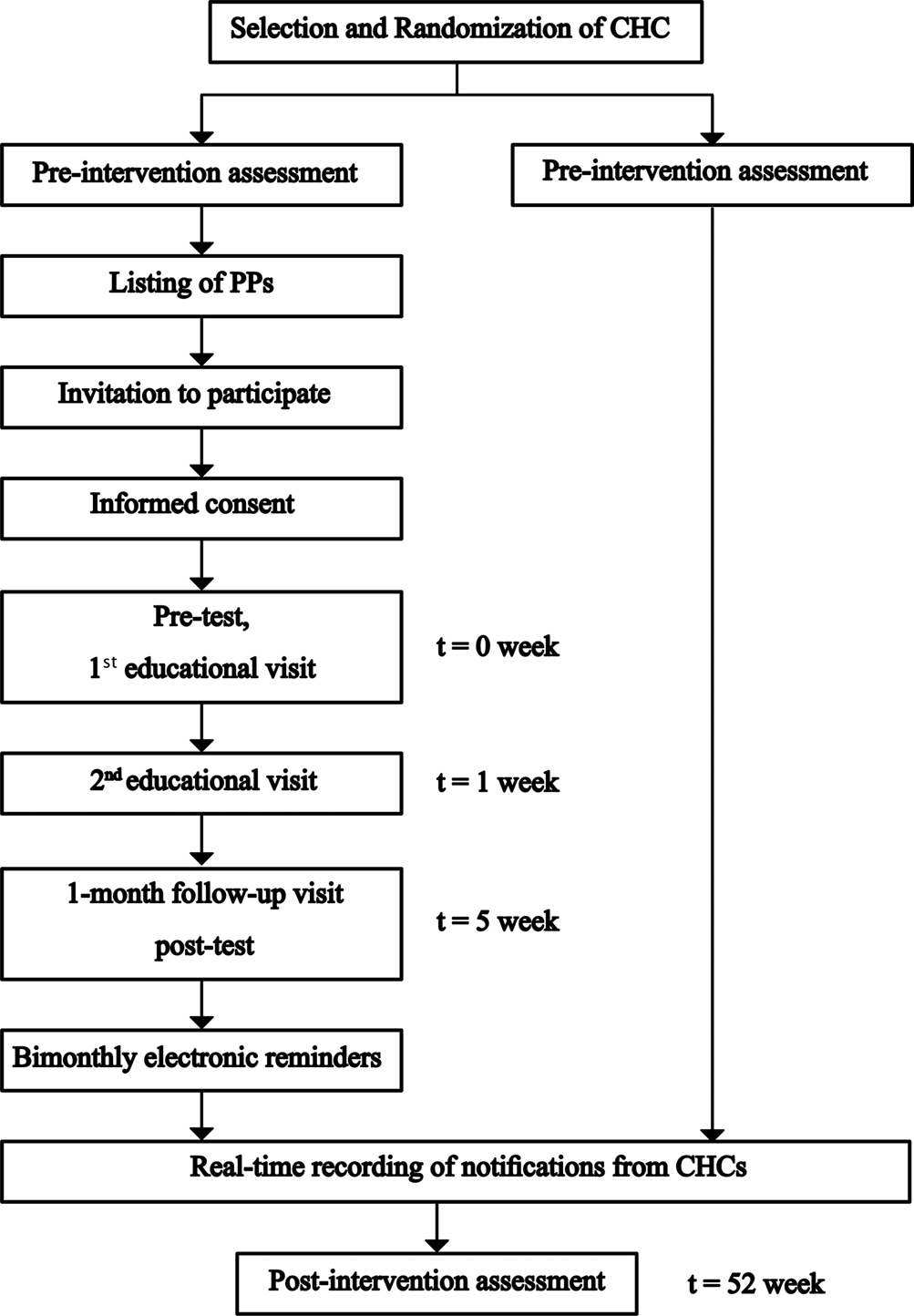 Bandung, a city of 2.5 million inhabitants, is served by 73 CHCs, each covering a defined geographic administrative area. Of these, 30 were randomly selected in proportion to population size for a previously conducted study.11 The 30 selected CHCs will be randomly allocated into intervention and control arms with 15 CHCs for each arm (Figure 1). The study population consists of all the people who may visit a PP in any of the selected CHC study areas during the year before and the year after the intervention. The outcome event is TB notification reported to the CHC by PPs in the selected study area.