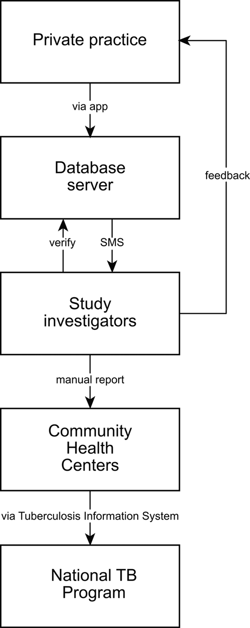 From PPs in the intervention arm, prior to the intervention, we will collect information on their name, gender, age, and self-reported number of TB cases diagnosed in the last 3 months. This will enable comparison of basic characteristics between those who participate in the intervention and those who do not. PPs who refer patients for confirmation of diagnosis and notification will enter the following data about the patient into the app: name, gender, age, basis of presumptive/definitive diagnosis, other practice addresses, and the referral plan for the patient. The following data will be abstracted from routine records of TB cases at the CHCs: referring facility/practitioner, date, gender, patient identification, patient address (to the level of CHC area), sputum status, and basis of TB diagnosis.