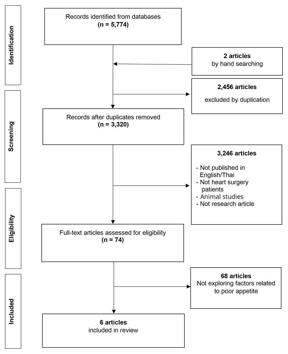 We searched CINAHL, SCOPUS, PubMed, ProQuest, ScienceDirect, ThaiLIS, ThaiJo, and E-Thesis databases and used snowballing through reference lists of defined studies. The search for both English and Thai published papers was made without restriction on publication year through August 2020. The search strategy used the keywords “cardiac surgery” OR “open-heart surgery” AND “poor appetite” OR “loss of appetite” OR “decreased appetite” OR “change in appetite” OR “anorexia.” The selection of studies was made based on the following inclusion criteria: (a) research in humans related to cardiac surgery; (b) results about factors related to loss of appetite in postoperative cardiac surgery patients; (c) patients aged 18 years and older; and (d) published in the English or Thai language.