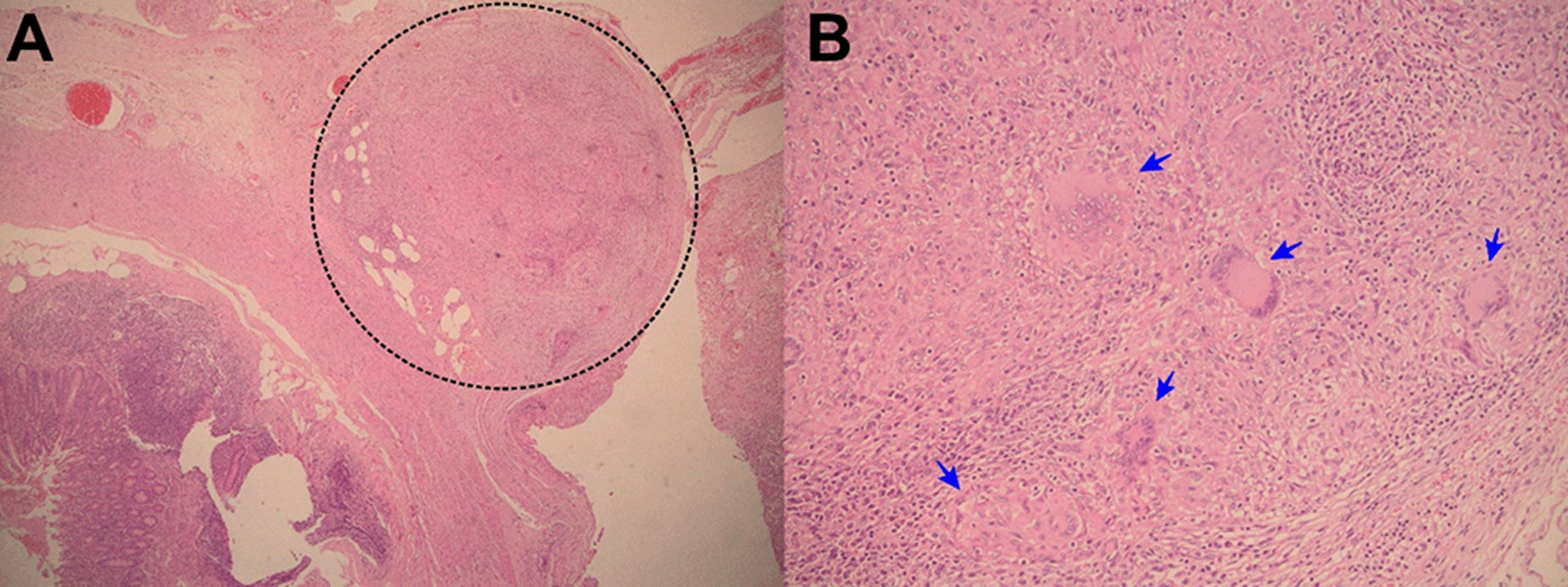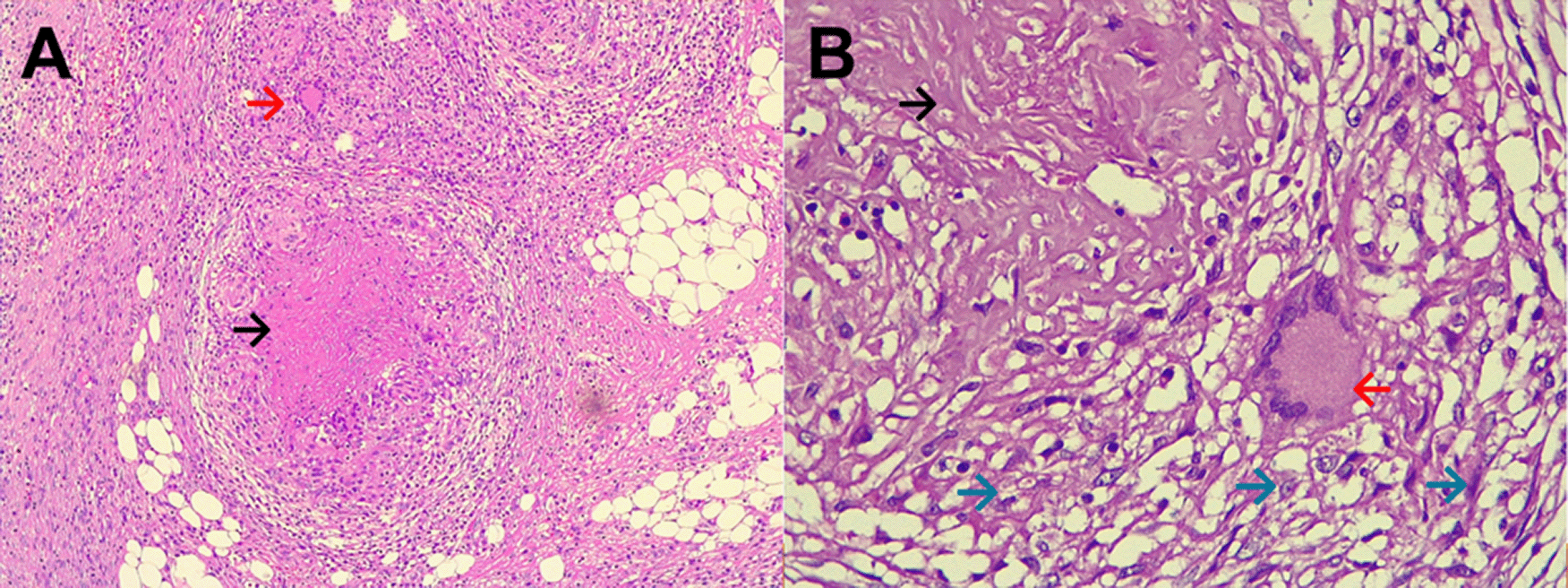 Evolution. One hour after surgery, because of clinical signs of hemodynamic shock, the patient was transferred to the intensive care unit (ICU). At ICU admission the patient was febrile (38.5°C), with hypotension (arterial blood pressure 70/30 mmHg), tachycardia (116 beats per minute), tachypnea (26 breathes per minute) without hypoxia (peripheric saturation 96% in ambient-air), severe dehydration with cold and mottled skin with prolonged capillary refill time, with sleepiness but respondent to verbal stimulus; the abdomen was distended and painful, with reduced intestinal peristalsis, and the wound (8 cm in length) of the recent surgery was macroscopically in order and percutaneous drainages in both iliac fossa were in place showing serohematic secretion. A broad-spectrum antibiotic therapy (meropenem and metronidazole) was started, together with supportive treatment including vasopressors (noradrenaline) and fluid replacement. After a week of the above-mentioned treatment, the clinical condition of the patient was improved and at the seventh day after the surgery, the patient was transferred from the ICU to another hospital division. Then, the result of the histopathological exams of samples collected during surgery showed: “chronic granulomatous inflammation, granulomas, extensive caseous necrosis and Langhans giant multinucleated cells; Ziehl-Neelsen (ZN) stain for Acid Fast Bacilli (AFB) negative”, and a diagnosis of abdominal TB was performed (Figures 1-3). Based on this result quadruple anti-tuberculous treatment (isoniazid 5 mg/kg, rifampicin 10 mg/kg, ethambutol 20 mg/kg, pyrazinamide 25 mg/kg) was initiated in concordance with Peruvian and international guidelines.11,12 Subsequently, the diagnosis was confirmed by a polymerase-chain reaction (PCR) for Mycobacterium tuberculosis in peritoneal fluid. The tuberculin skin test (Mantoux or PPD test) was negative. Serial ZN smears for AFB in urine, sputum, secretion of both pelvic drains, were negative; adenosine deaminase test in peritoneal fluid 292.7 U/L (reference value < 40 U/L). Blood cultures, and cultures for common pathogens, fungi, and M. tuberculosis in urine and peritoneal fluid were negative. Before discharge, the patient was evaluated by an oncologist who suggested some other exams: serum tumor markers (CEA, CA 125, AFP, CA19.9, β-HCG), esophagogastroduodenoscopy, and colonoscopy with ileoscopy, all of which were within normal ranges. In addition, contrast-enhanced chest-abdomen-pelvis computed tomography (CT) and magnetic resonance imaging (MRI) showed “multiple nodular implants in spleen, gut, and peritoneal cavity; but no hepatosplenomegaly or abnormal lymph nodes enlargement” (Figure 4). One week after the start of the antituberculosis treatment, the patient was discharged from hospital because of clinical improvement.