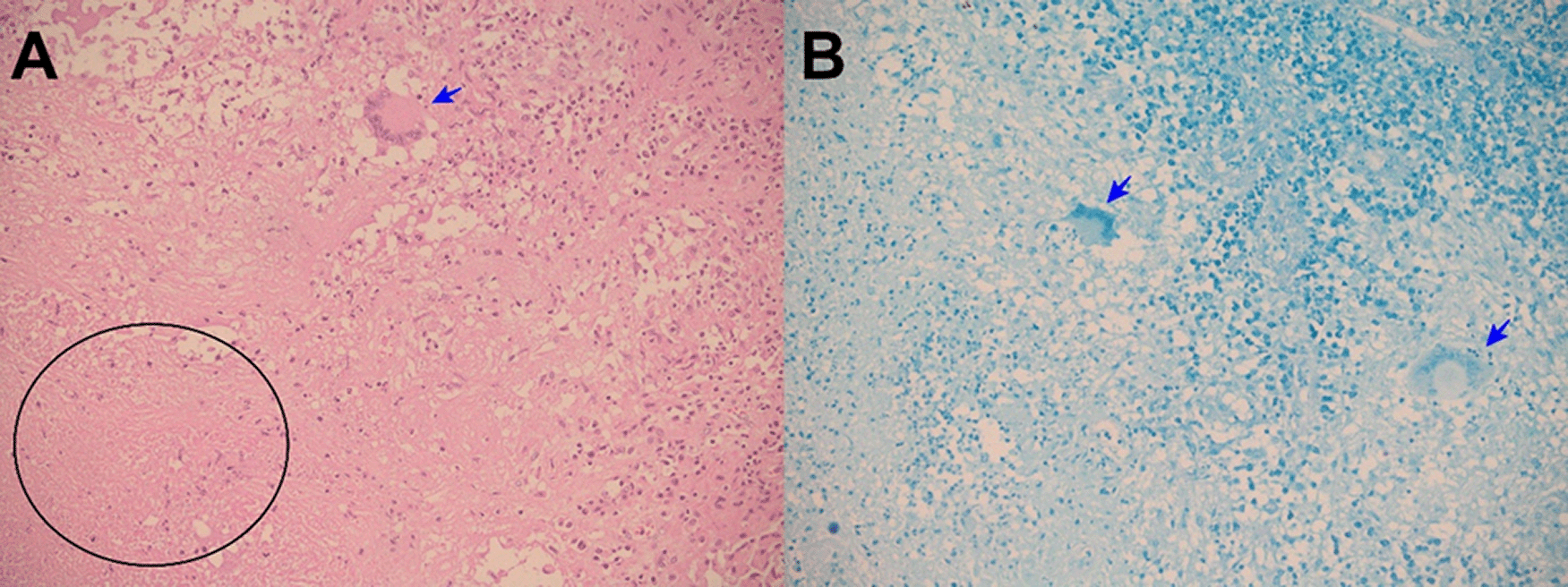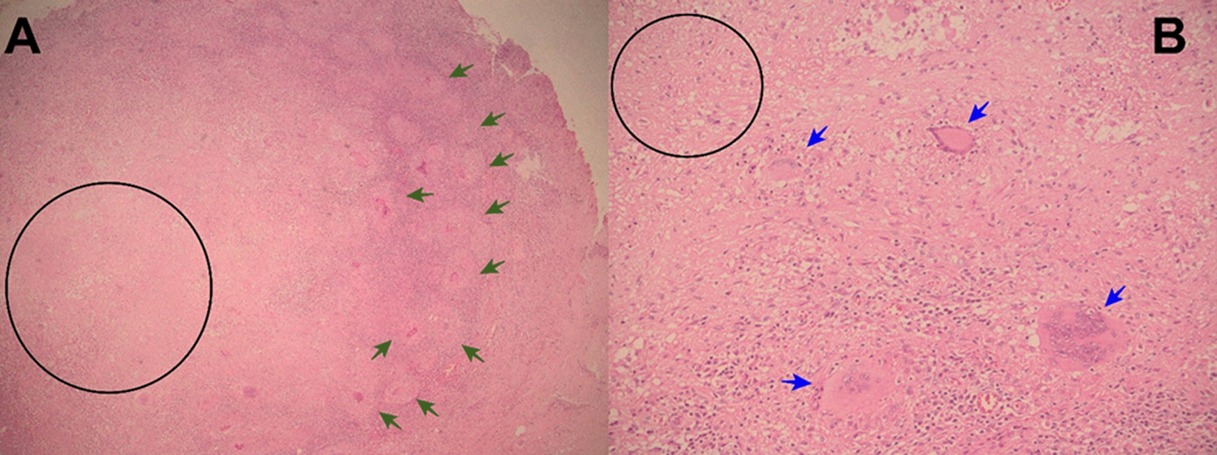 Evolution. After admission, acute abdomen due to appendicitis was diagnosed. Symptomatic treatment was initiated and preoperative exams and plain chest and abdominal x-ray were ordered, which showed significant bilateral pleural effusion and ascites. Three hours after admission, the patient was transferred to the operating room. During exploratory laparotomy “multiple cerebroid nodules scattered through parietal and visceral peritoneum, small bowel, colon and epiploon; and plenty of ascitic fluid were observed”. The postoperative diagnosis was “carcinomatosis”. After surgery, he was transferred to the ICU, and continued treatment with saline, noradrenaline, imipenem, metronidazole, sedation with midazolam, analgesia with fentanyl, and ventilatory support. Based on clinical data, risk factors, intraoperative findings, and chest x ray imaging, TB was suspected. Then, stains and cultures of multiple samples for Mycobacterium tuberculosis (MTB) and a contrast-enhanced tomographic scan of thorax, abdomen and pelvis were ordered (Figure 5). Three days after surgery thoracocentesis was performed. Five days after surgery RT-PCR resulted positive for MTB in pleural fluid and quadruple anti-tuberculous treatment for MTB was initiated (the same scheme as Case 1). Ten days after surgery histopathology of epiploon was obtained, showing extensive caseous necrosis with granulomas and Langhans multinucleated giant cells. The patient died seven days after initiation of anti-tuberculous treatment due to refractory septic shock (Figure 6). A serial ZN smear for AFB in bronchial secretion, blood cultures, and urine culture, were negative. Serologies for HIV, HTLV-1, hepatitis B and C, and RPR/VDRL, were also negative.