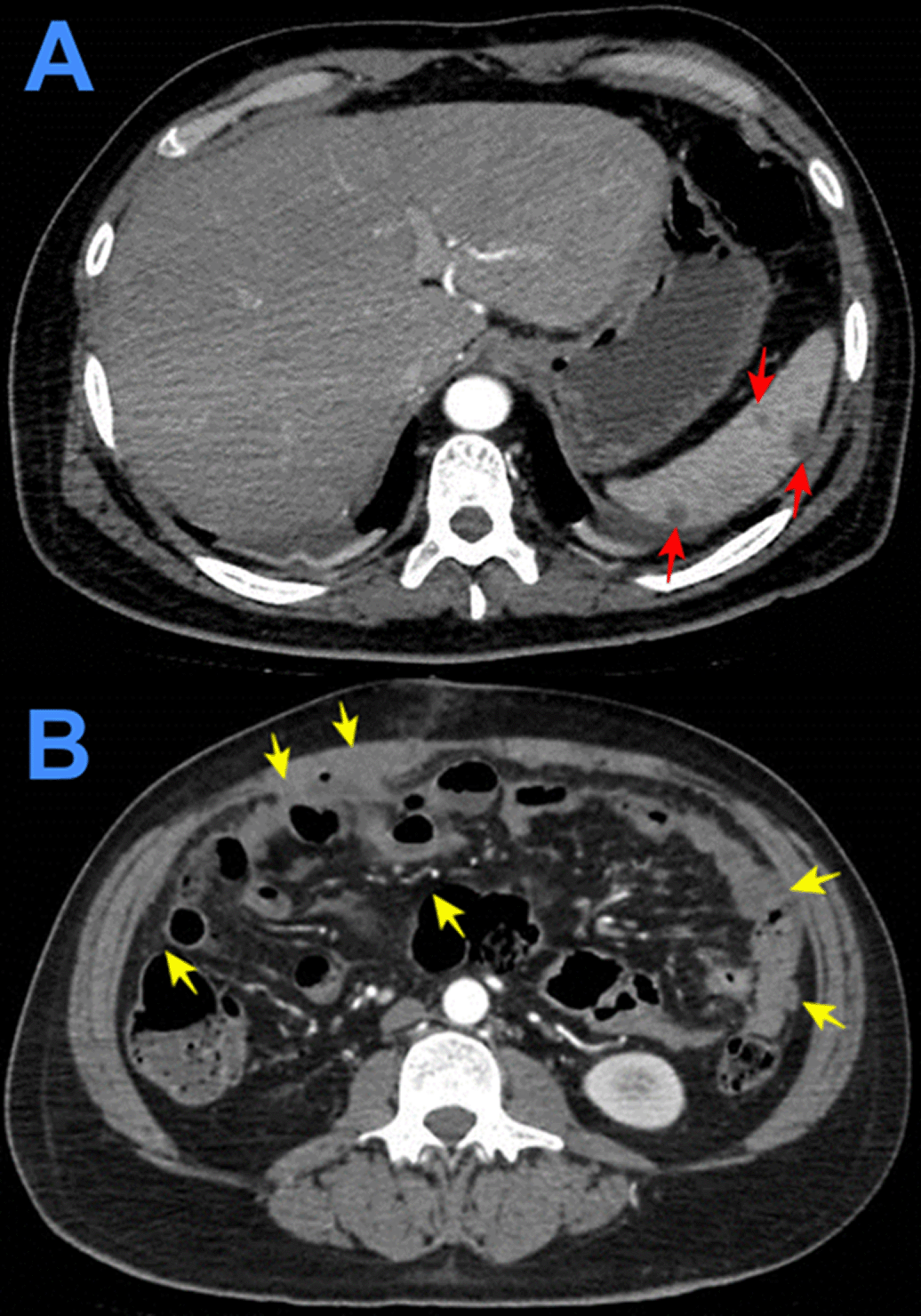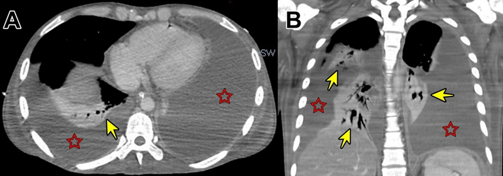 Physical examination at admission. The patient was emaciated and mildly dehydrated; blood pressure: 100/60 mmHg, respiratory rate: 20 breathes per minute, heart rate 136 beats per minute, temperature: 37.9 °C, and oxygen saturation: 95% at room air. Absent breathe sounds and dullness in both lung bases. Tachycardia. Distended and painful abdomen, bowel sounds diminished in frequency, McBurney’s and Blumberg's signs were positive. Awake and oriented patient, no focal deficit, no meningeal signs.