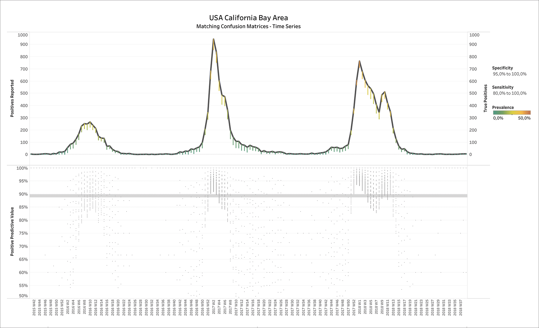 Figure 2 shows the results of applying BLT to weekly influenza test data from the Californian Bay Area, USA. The upper panel displays the number of positive tests reported over time, where the estimated number of TPs is overlaid in small dots (CMs) whose color represents the estimated prevalence (see legend on the right of Figure 2). Filters have been applied on specificity (95.0% - 100.0%) and sensitivity (80.0% - 100.0%). One could see that the number of TP tests is close to number of positives reported, except for some deviations during the spring and summer months when prevalence was estimated correctly as low.