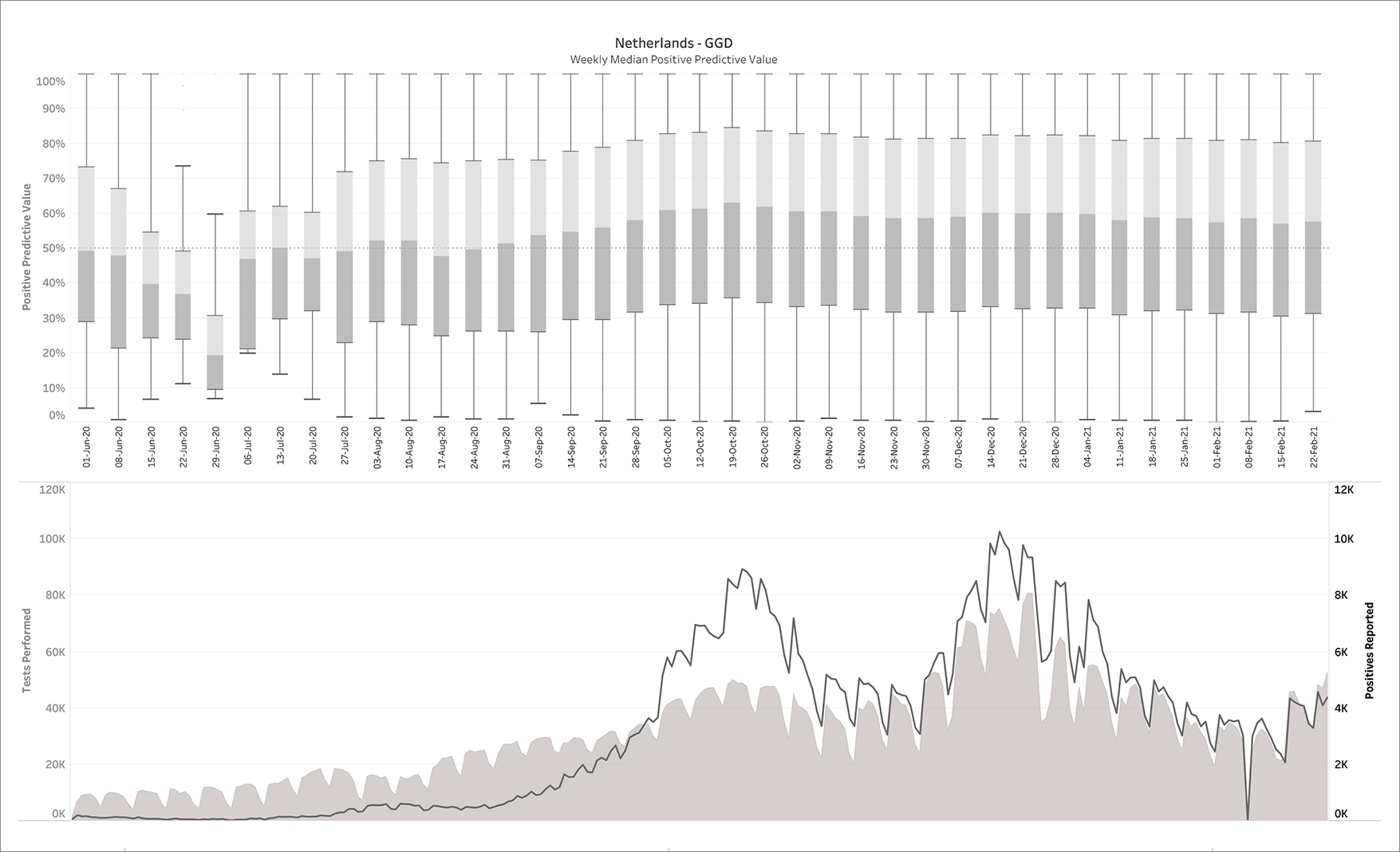 269 daily reports were downloaded from the Dutch government Corona dashboard and processed with the SQL-query. This resulted in 809,830 CMs matching the daily reports from June 1st, 2020 until Feb 24th, 2021. The upper panel of Figure 3 plots the median PPV, with the corresponding number of performed and positive tests plotted in the lower panel. Note that the left and right y-axes in the lower panel are on different scales.