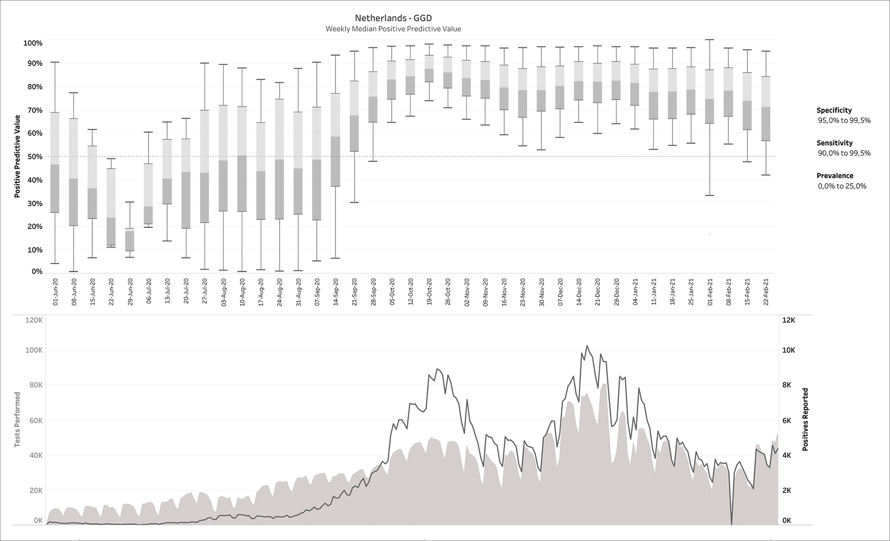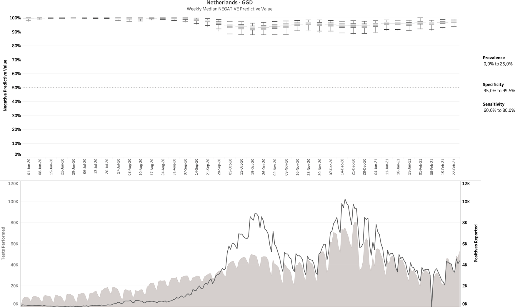 For the true positives, the color shows details about prevalence. The Specificity filter ranges from 75.0% to 100%. The Sensitivity filter ranges from 30.0% to 100.0%. Reports range from week ending 26th February 2020 until week ending 17th February 2021.