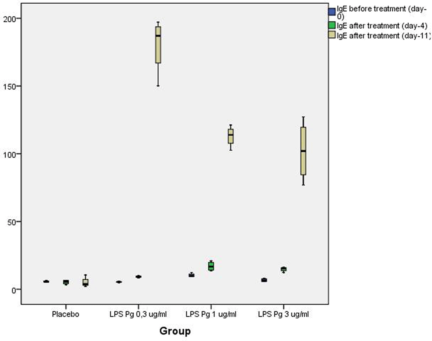 Prior to experiments (day-0), there was no difference of serum IgE level between the four groups (p > 0.05). On day-4, there was a significance difference of serum IgE level between all groups (p = 0.006). At day-4, the highest average IgE level could be found in Group 3 treated with LPS Pg 1 μg/ml (17.00 ± 1.69 pg/ml) and the lowest average IgE level could be found in Group 1 (control) (5.31 ± 0.76 pg/ml). On day-11, there was also a significance difference of serum IgE level between both groups (p = 0.047). At day-11 the highest average IgE level could be found in Group 2 treated with LPS Pg 0.3 μg/ml (180.34 ± 10.42 pg/ml) and the lowest average IgE level could be found in Group 1 (5.06 ± 1.86 pg/ml) (Table 2).