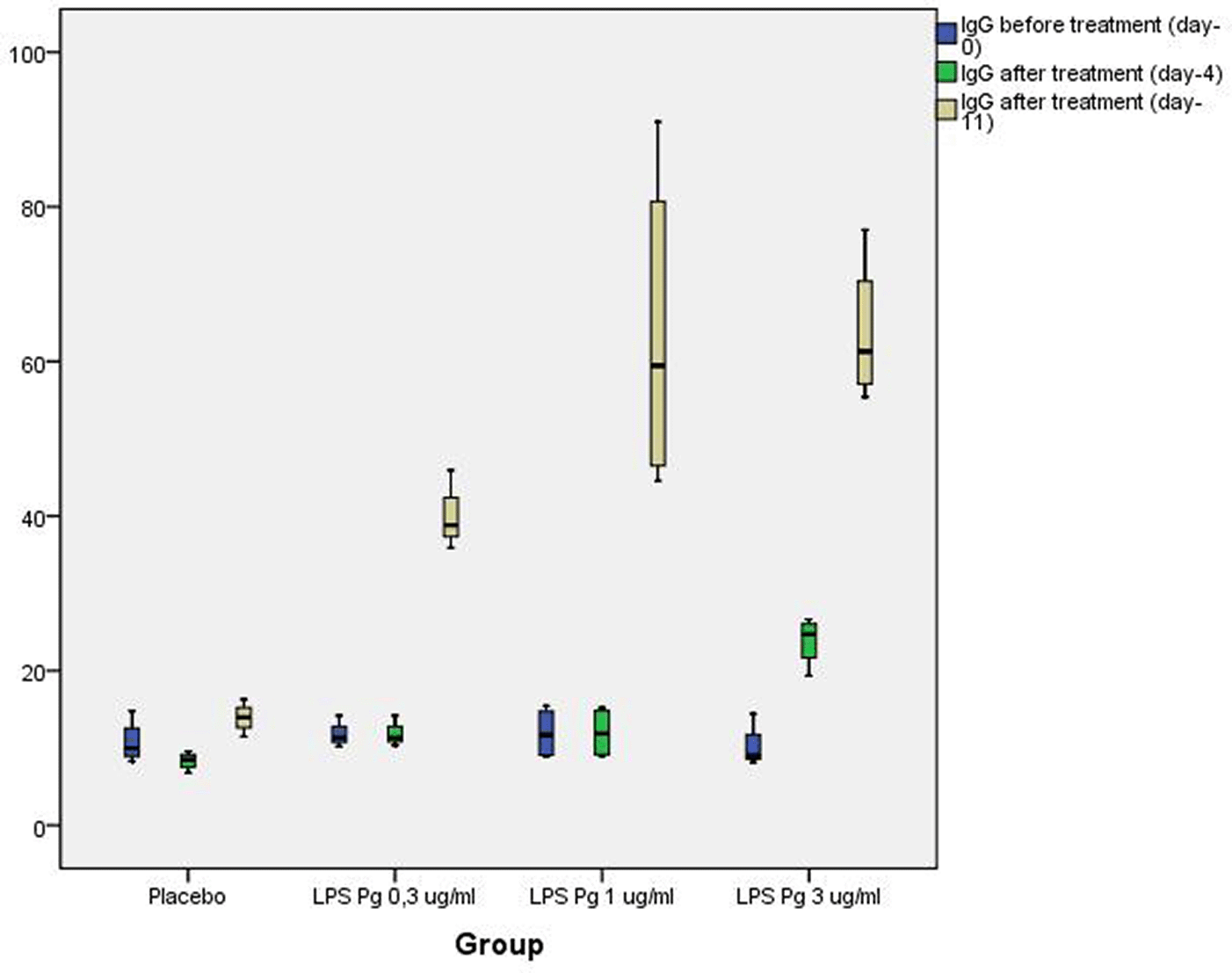Prior to experiments (day-0), there was no difference of serum IgG4 level between the four groups (p > 0.05). On day-4, there was a significance difference of serum IgG4 level between all groups (p = 0.008). At day-4, the highest average IgG4 level could be found in Group 4 (LPS Pg 3 μg/ml; 23.86 ± 1.59 ng/ml) and the lowest average IgG4 level could be found in Group 1 (8.34 ± 0.58 ng/ml). On day-11, there was a greater difference of serum IgG4 level between all groups (p = 0.005). At day-10, the highest average IgG4 level could be found in Group 4 (LPS Pg 3 μg/ml; 63.74 ± 4.74 ng/ml) and the lowest average IgG4 level could be found in Group 1 (13.91 ± 0.99 ng/ml) (Table 3).