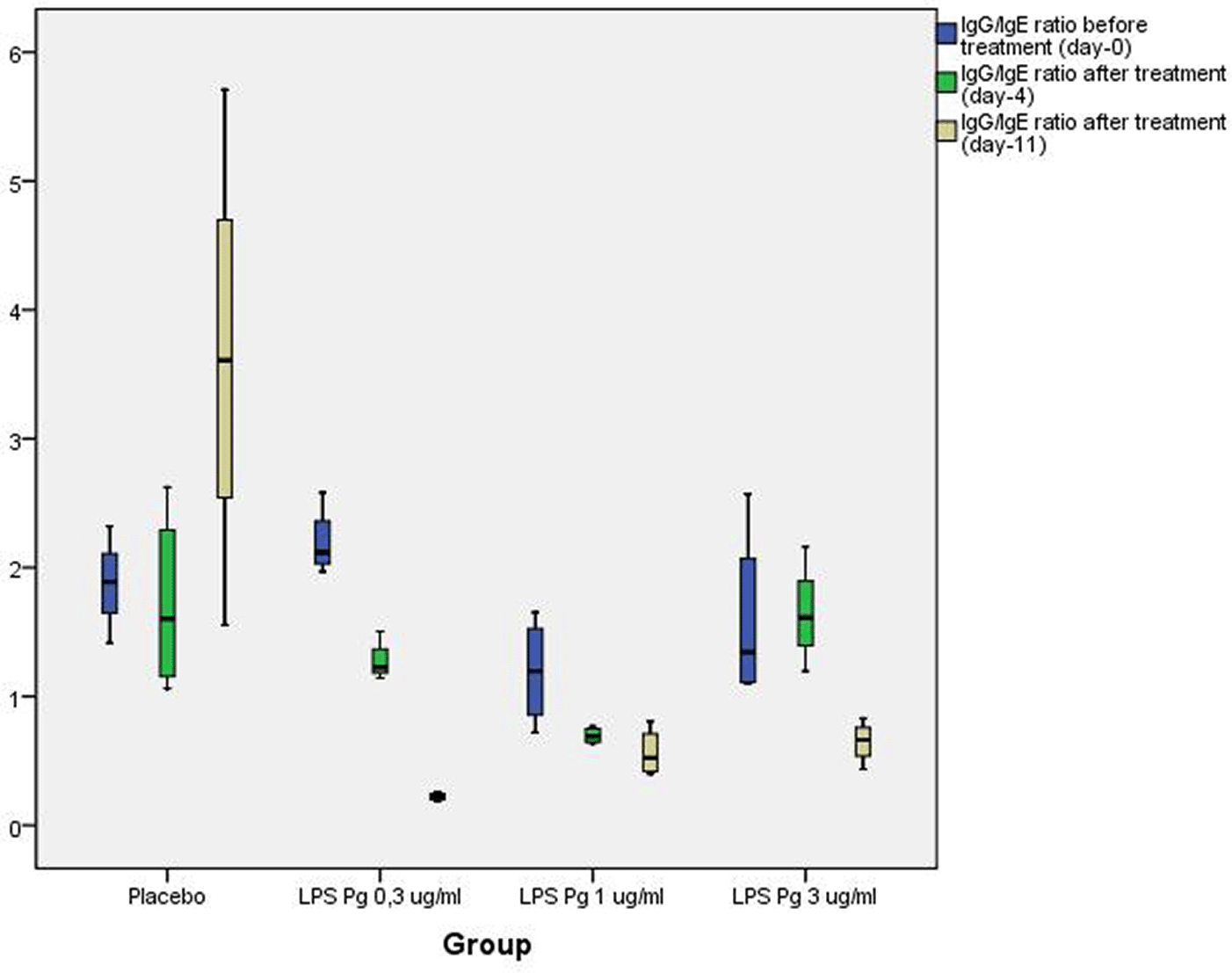 Results: Levels of IgE and IgG4 increased significantly following exposure of LPS Pg at day-4 and day-11. Greater increase of IgE rather than IgG4 contributed to rapid decline of IgG4/IgE ratio, detected in the peripheral blood at day-4 and day-11.