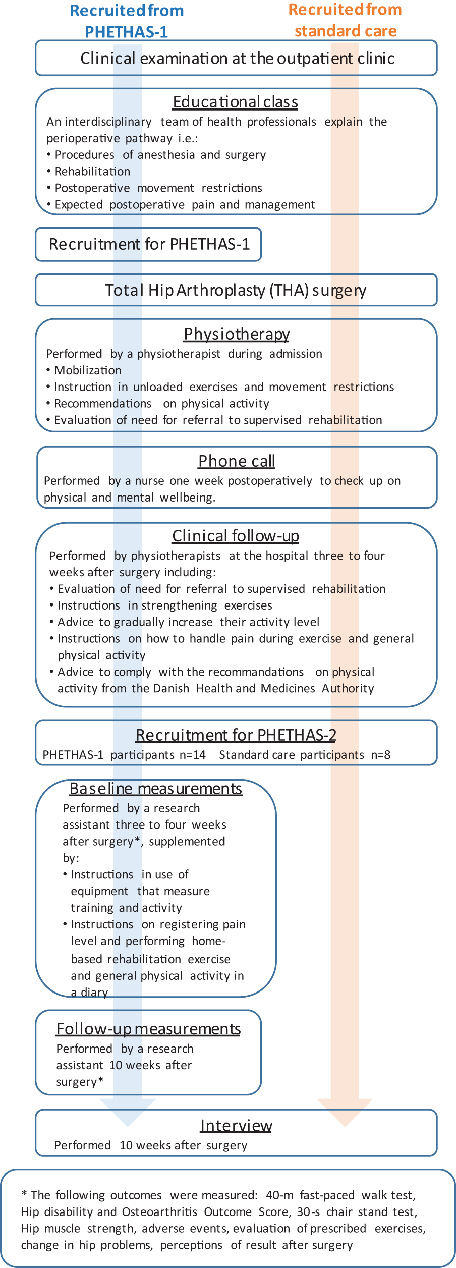 The PHETHAS studies were founded to support and optimize clinical pathways with patients rehabilitating at home after THA. PHETHAS-1 (ClinicalTrials.gov NCT03109821, April 12, 2017) quantitatively investigates the physical outcomes of performing a home-based rehabilitation exercise program, which after initial instruction was performed without further supervision,12 while this study, PHETHAS-2, qualitatively investigates how patients perceive this home-based rehabilitation exercise and general physical activity after THA, focusing on facilitators and barriers.