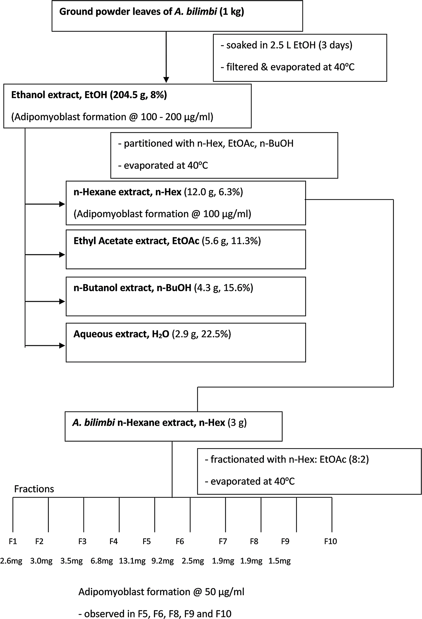 Bilimbi leaves were sampled from an orchard with the owner’s permission. The botanical authentication of the specimen was conducted by botanists of the School of Biological Sciences, Universiti Sains Malaysia (USM) and a voucher specimen 11738 was deposited in the herbarium of USM. Fresh leaves were dried in an oven at 45°C until the percentage yield of moisture content value was less than 10%. Dried leaves were then ground to a fine powder using a grinder then weighed, recorded and kept in a plastic bag. The powder was soaked in ethanol (EtOH) for 3 days at room temperature. After filtration with Whatman No. 1 filter paper, the solvent was removed under reduced pressure at 40°C using a rotary evaporator (Buchi, Switzerland) to obtain the crude ethanolic extract. The weight and percentage yield were recorded, stored in an amber bottle, labelled and kept refrigerated until further use. Next, the crude was sequentially extracted with organic solvents - namely n-hexane (n-Hex), ethyl acetate (EtOAc), and n-butanol (n-BuOH) with increasing polarity respectively. The filtrate was then concentrated and dried under reduced pressure at 40°C using a Buchi rotary evaporator. The remaining ethanolic aqueous layer was evaporated and lyophilised in a freeze-dryer. The weight and percentage of each yield was recorded and kept refrigerated. A flow diagram showing the step-by-step extraction and partitioning processes is depicted in Figure 1.