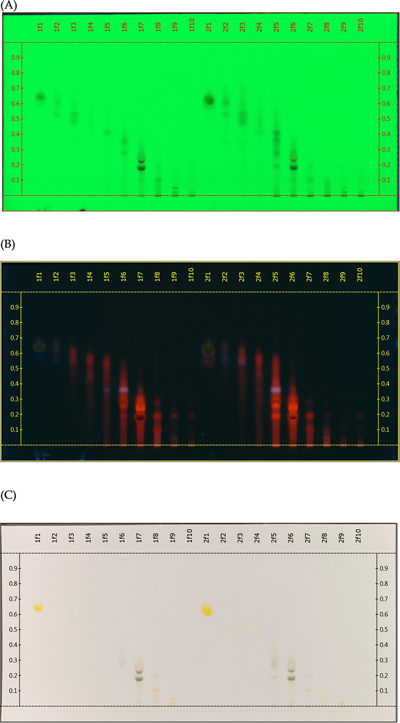 Two batches (1 & 2) of fractionation samples were collected and run on the same plates (A) TLC plate image viewed under UV 254 nm. (B) TLC plate image viewed under UV 366 nm. (C) TLC plate image viewed under white light illumination.