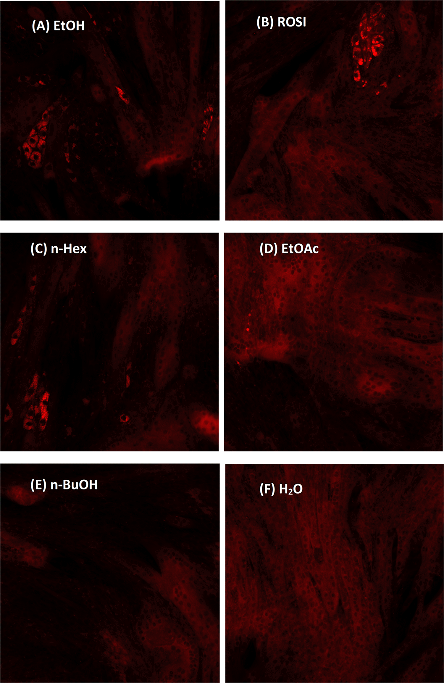 Lipid droplets formation upon adipogenesis upon treatment by (A) 200 μg/ml EtOH, (B) 1 μM ROSI, (C) 100 μg/ml n-Hex, (D) 100 μg/ml EtOAc, (E) 100 μg/ml n-BuOH and (F) H2O were stained by a Nile Red solution. Treatment of myoblasts with adipogenesis stimulants facilitated myocytes and adipocytes co-differentiation.