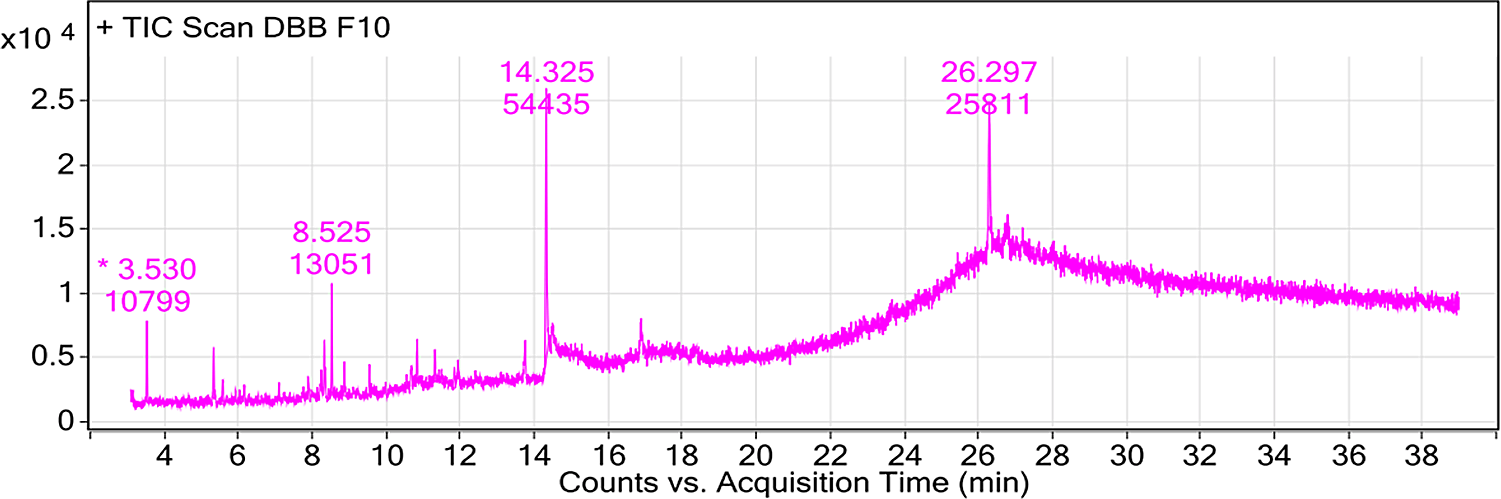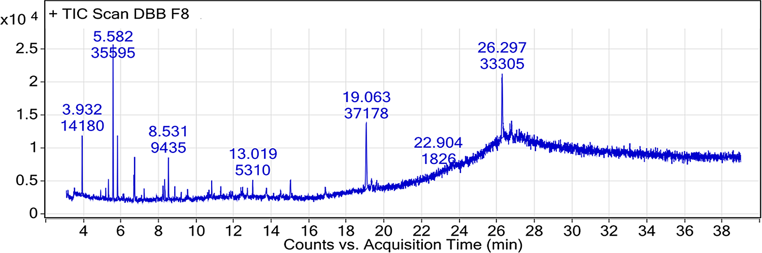 The database information search via the MassHunter Library WION 14.L revealed the presence of nine predominant compounds in f8, ten in f9, and five in f10. (1.alpha., 4.alpha., 4a.alpha., 10a.alpha.) -1, 4, 4a, 5, 6, 7, 8, 9, 10, 10a -decahydro- 1, 4, 11, 11-tetramethyl-1, 4-methanocycloocta [d] pyridazine and i-propyl 3- (phenylamino) -2- (phenylseleno) -3- (phenyl) propanoate were detected in all the three fractions whereas nonanal and hexadecanoic acid were commonly present in f9 and f10. The high abundance compounds include 3-nonen-2-one; 2(4H)-Benzofuranone, 5, 6, 7, 7a-tetrahydro -6- hydroxy-4, 4, 7a-trimethyl-, (6S-trans)-; hexadecanoic acid; (12R)-(9Z)-12-hydroxy-9-octadecenoic acid; spiro [2.4] heptanes-5-carboxaldehyde; and i-propyl 3 -(phenylamino) -2- (phenylseleno) -3- (phenyl) propanoate.