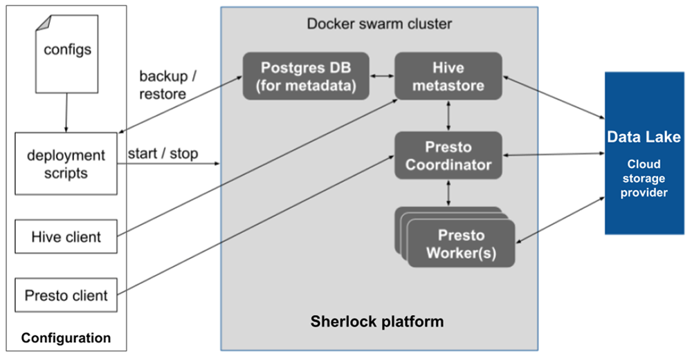 For Sherlock, we developed a dockerized version of Presto that also incorporates the Hive metastore. This addition of the query engine and metastore makes Sherlock cloud-agnostic, so it can be installed at any cloud provider, providing it in a Linux machine with Docker installed. The advantage of running Presto in a dockerized environment is that it enables the automatic installation and configuration of the whole Presto Query Engine. Furthermore, the whole platform can be fired up on a local machine, multiple machines or any cloud service. We show how to make a set of Linux virtual machines with Docker installed, then start a distributed Presto cluster by using the Sherlock platform under the deployment section of the GitHub page of Sherlock (https://earlham-sherlock.github.io/docs/deployment_guide.html).