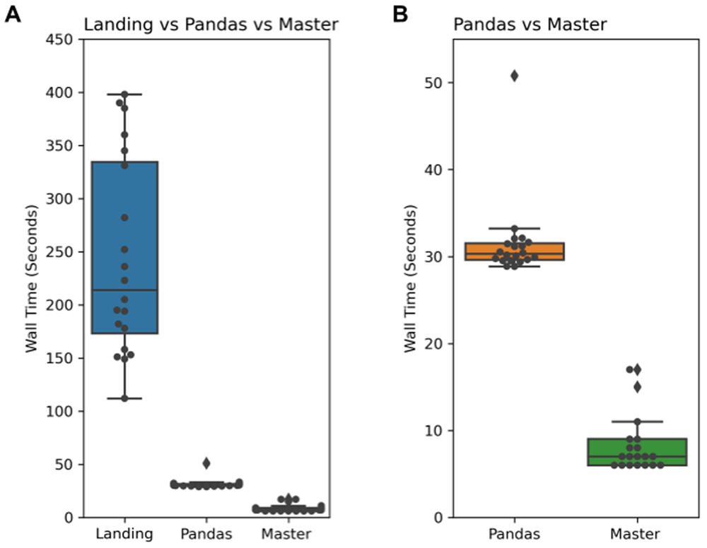 A: The wall time comparison between the three different approaches for 20 repeated queries. After evaluating the run time performance, queries running in the master zone are ~20–30 times faster than those in the landing zone and ~3–4 times faster than Pandas. The significant deviation in the landing zone is due to the connection with S3 on Digital Ocean. During longer queries, it can result in a bottleneck hence the need for master zone's optimized data format. B: The speed difference between Pandas and the master zone’s ORC format. The master zone queries ~3–4 times quicker than Pandas. Therefore, it demonstrates the performance increase of adopting the ORC format in the master zone, which enables this increase in performance.