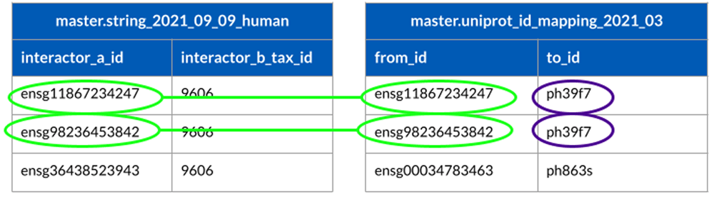 Two different datasets are needed to execute this example SQL query. Table one contains the information from the STRING database (not showing all of the columns from the actual table) and the second table is a mapping table containing the mapping between the different types of protein identifiers from different sources (Ensembl (https://www.ensembl.org/info/genome/stable_ids/index.html) and UniProt (https://www.uniprot.org/help/accession_numbers)) (Figure 8). With the following example query, Sherlock can map between different identifiers, using two tables from the master zone.