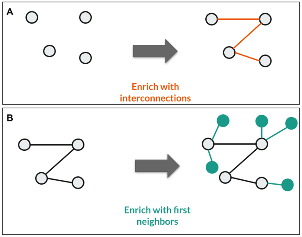 A: With the given SQL query, Sherlock can find the interconnections between the selected proteins in this step. B: After a single logical operator change between the two queries (AND operator to the OR operator), Sherlock can also identify the selected proteins' first neighbors.