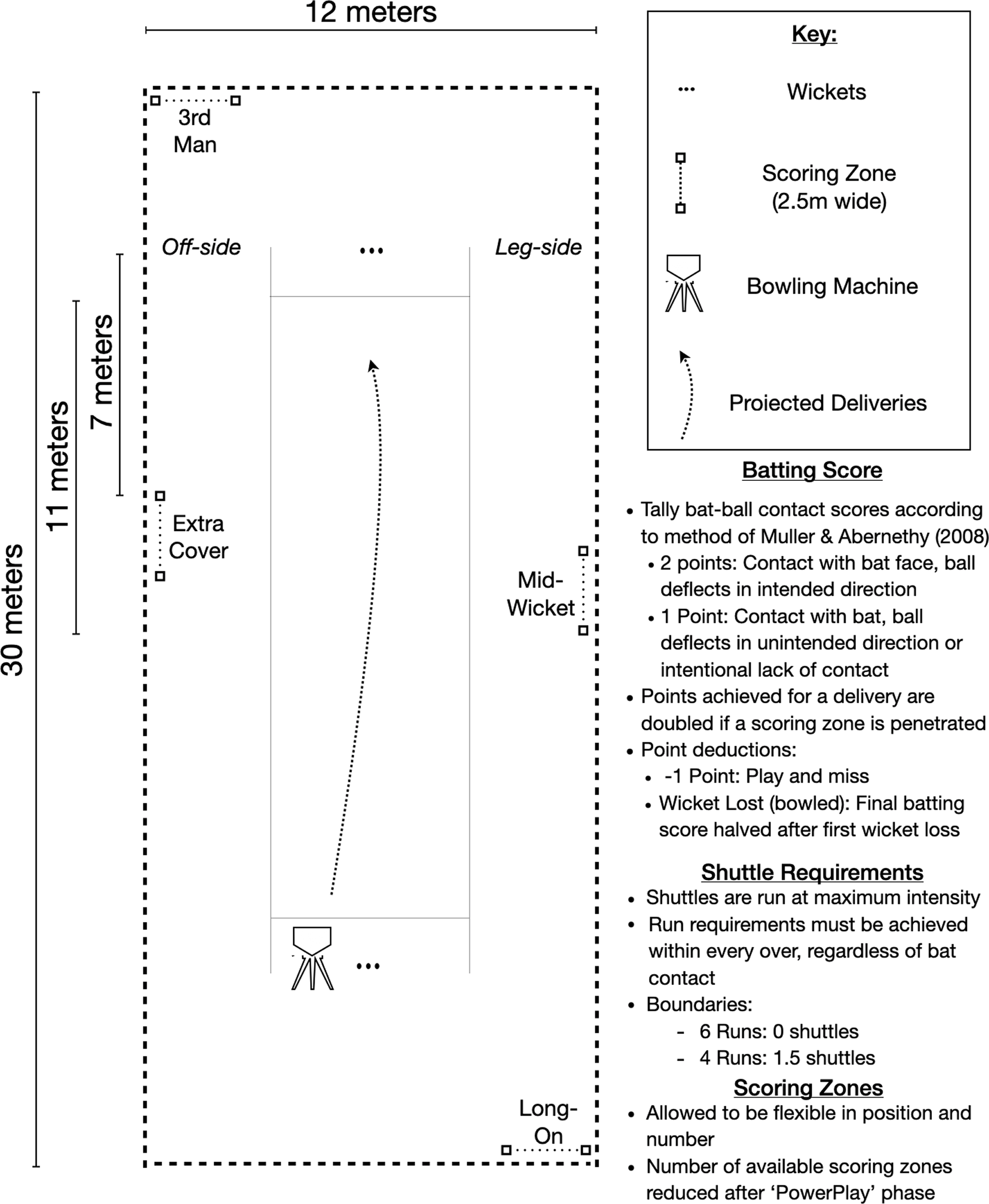 During each on-strike delivery, the batter is free to select which on-strike deliveries to score from and what run type is achieved from a given delivery. The only constraints placed are that the batter must match the run type with the achieved stroke and that all required shuttles for an over must be achieved. To match run type with achieved stroke for a given delivery, batters are required to penetrate a scoring zone to be awarded ‘four’ and bat-ball contact must be achieved for all other run types. However, if the number of on-strike deliveries remaining in an over are near-depleted, shuttles may be enforced regardless of achieved contact or scoring zone penetration. For a ‘1’ batters should complete a single shuttle (17.68m) likewise, for ‘2’s batters should complete a double shuttle, and three shuttles for a ‘3’. For all shuttles, batters are required to complete a 180º turn at the end of the crease when completing the final shuttle for a given delivery. Boundaries will require one and a half shuttles for a ‘four’ and no shuttles for a ‘six’. When the batter is off-strike, instruction from the audio tape will dictate the required shuttles necessary for each off-strike delivery and the batter will complete these shuttles beginning on the audio cue. After necessary shuttles have been completed the batter will walk back to the striking crease. Shuttles must be run at maximum intensity akin to match play where batters attempt to maximize the number of runs scored from every delivery.
